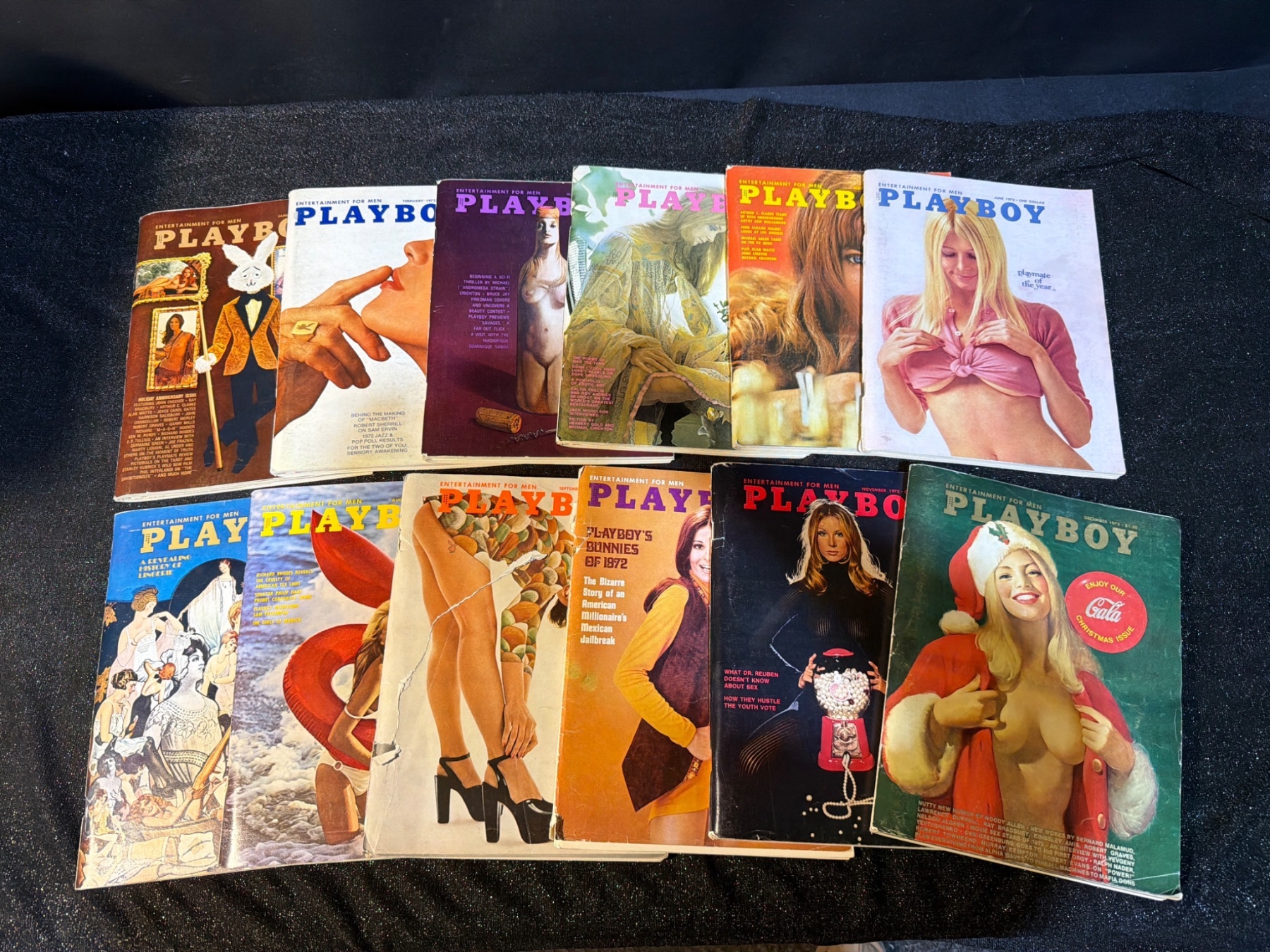 Playboy magazines from 1972 and 1973. Includes issues showcasing iconic covers, vintage advertisements, and articles from the era. Each magazine measures approximately 8.5 x 11 inches. Condition varies with some wear consistent with age, such as creases and small tears, yet overall intact and collectible. An excellent set for enthusiasts of classic magazines or vintage pop culture.