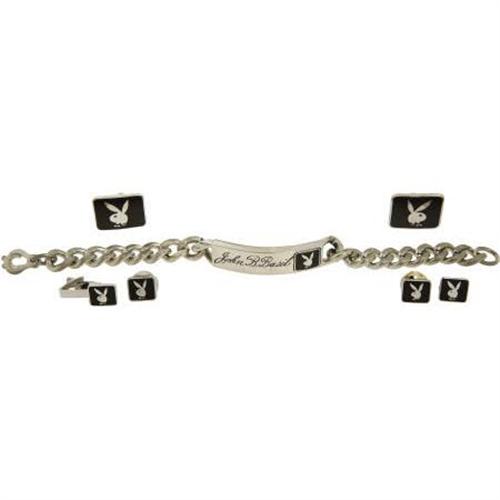<B>Playboy Vintage Jewelry (c. 1960).</B></I> Seven matching pieces of vintage Playboy jewelry comprise this lot, all displaying the classic Playboy rabbit in rhodium against a black background. Included are a set of cufflinks, 2 tie tacks, a lapel pin, a tie clip, and a personalized chain bracelet ("John B. Basil"). All come with a period jewelry case for storage, in dark wood with black leatherette top, and a cushy gold interior. To spruce up the inside of the box, the consignor has also included 3 six-stamp blocks, commemorating Playboy's First Lady, Marilyn Monroe. Quite a collection of early Playboy artifacts!<BR><BR><b>Shipping:</b> Miscellaneous Collectibles, Smal (<a target="_blank" href="http://www.heritageauctions.com/common/shipping.php">view shipping information</a>)