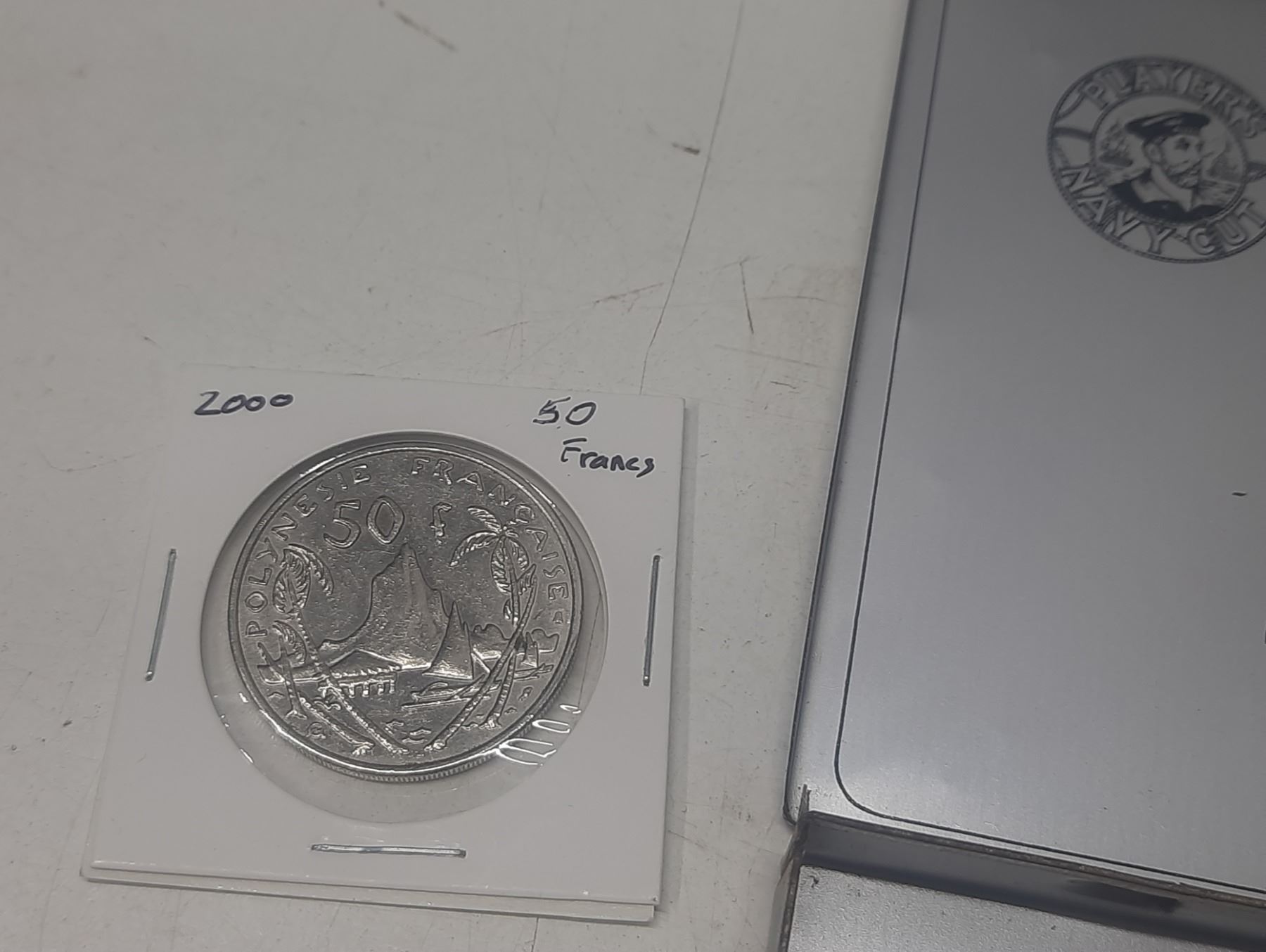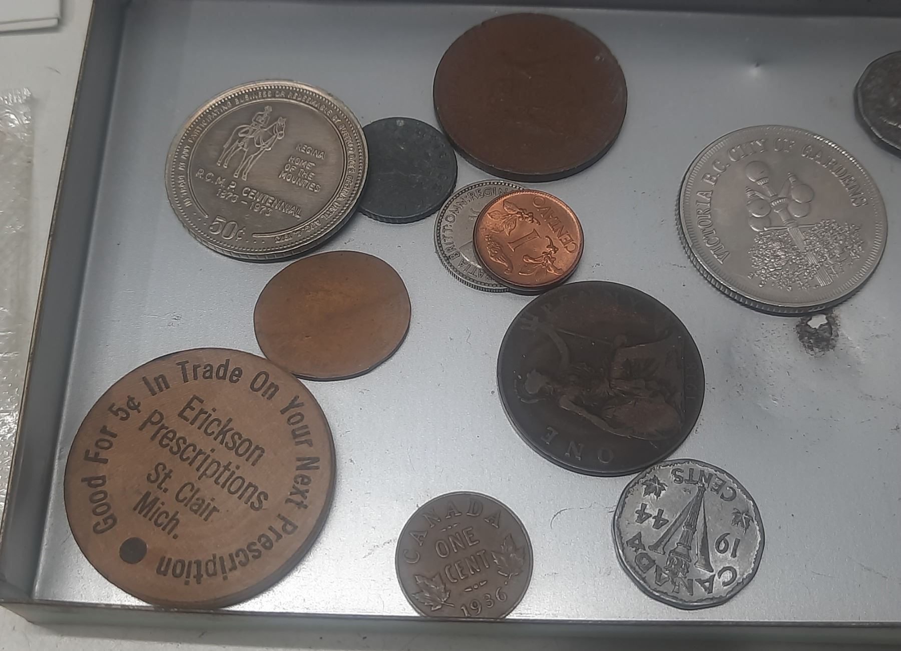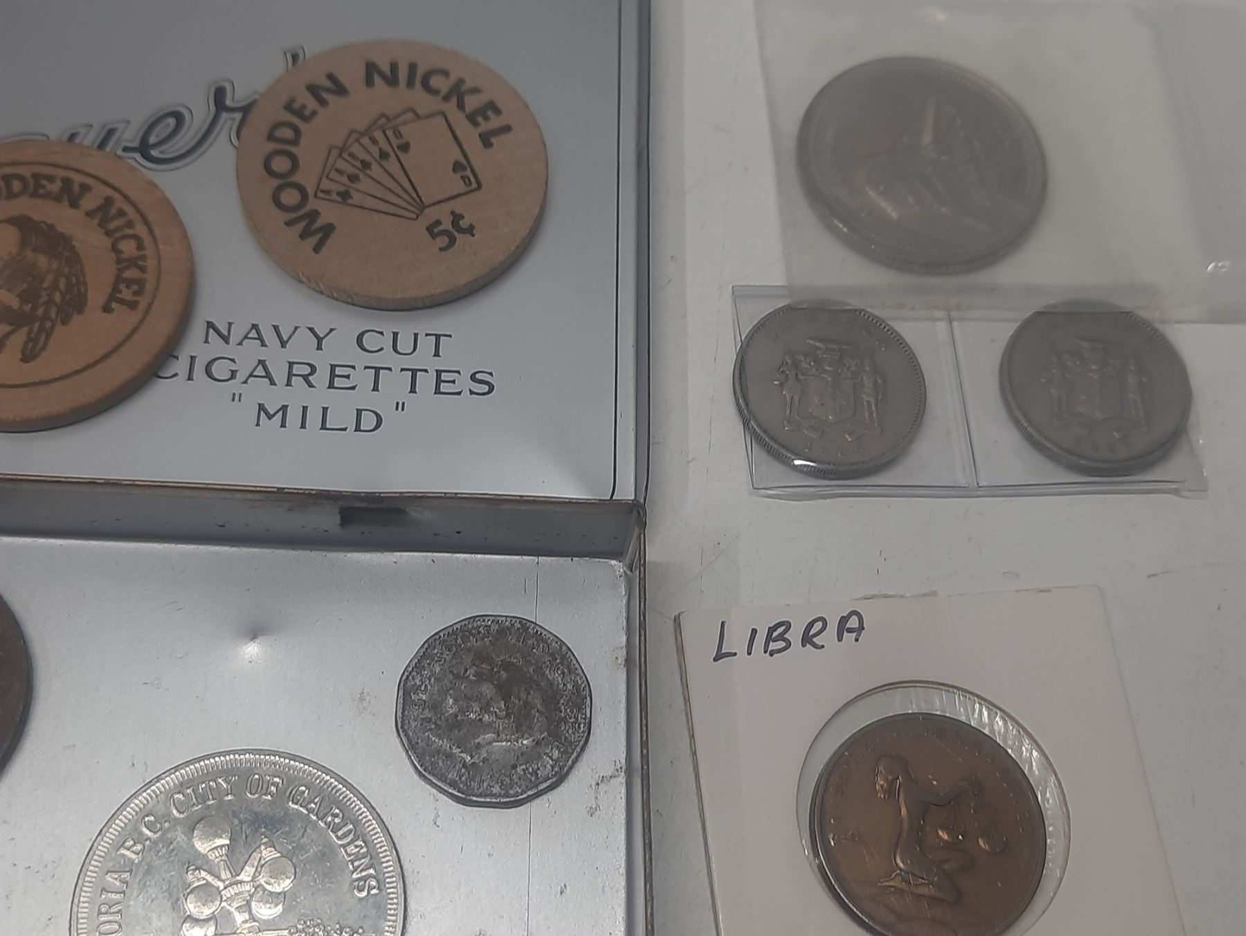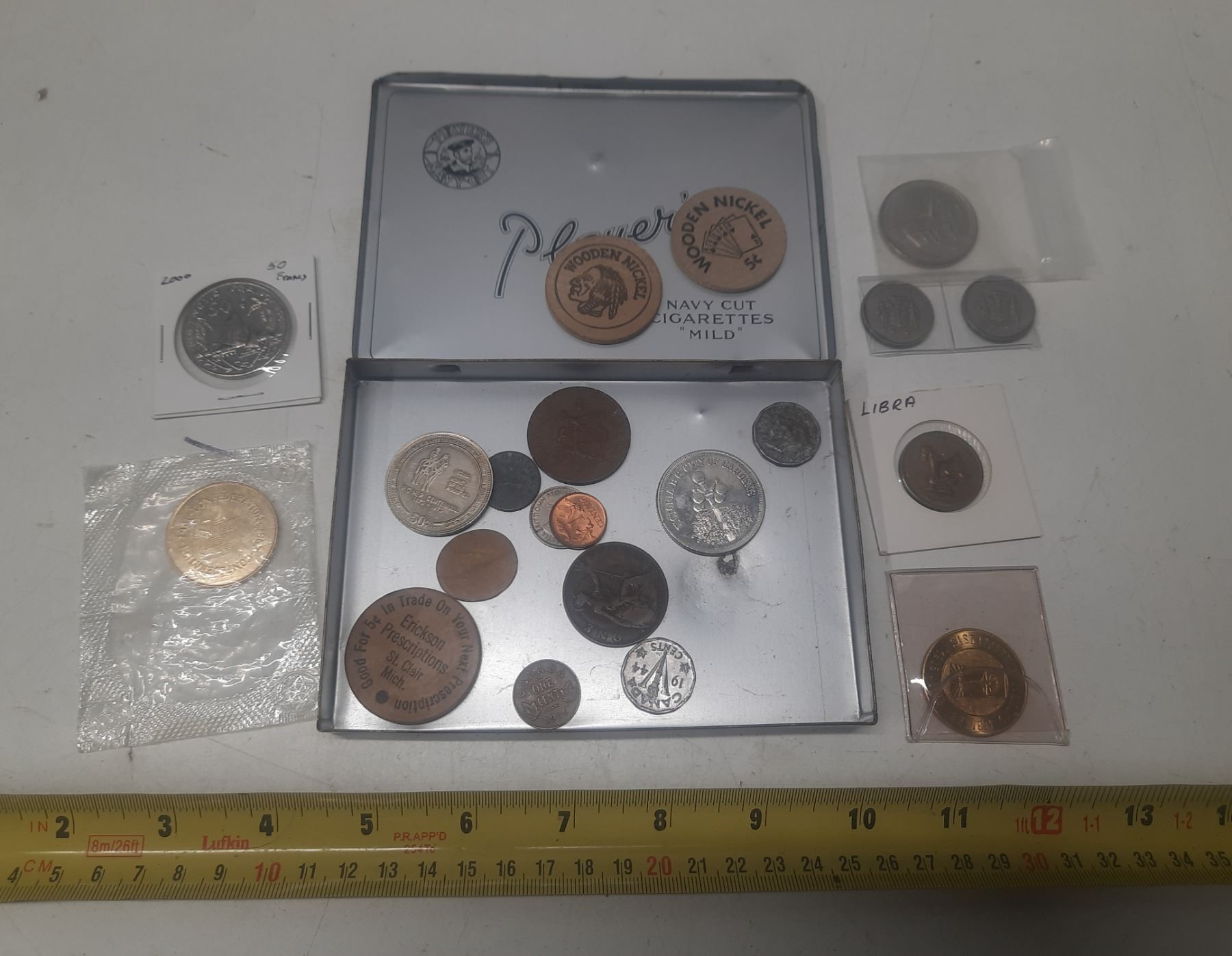 Players Cigarette Tin with assorted Medallions, Coins & Wooden Nickels