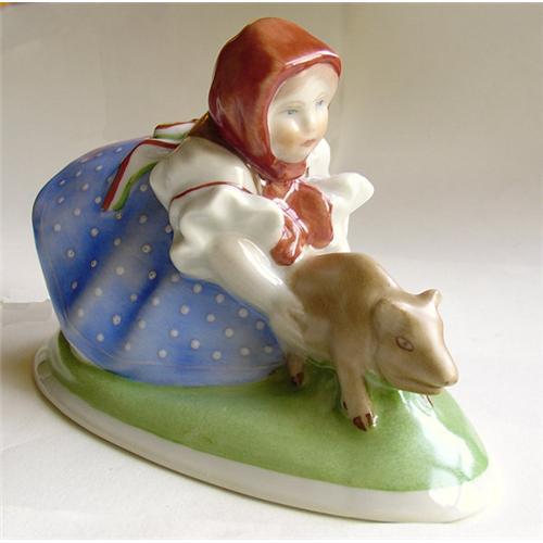 Herend hand-painted porcelain figurine. A young girl dressed in a white blouse, billowing blue dotted skirt , and a red head scarf tied around her neck stoops to grab a light brown piglet. Her expression is pensive yet caring, giving the work charm and humanity. Marked on base with stamped post-1949 Herend logo and impressed HEREND and 5516.