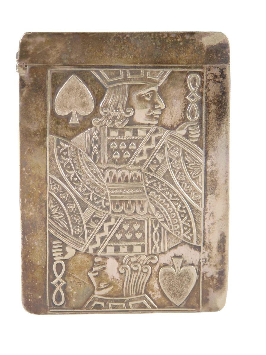 Playing Card Box, silver plated. King of spades on front and whist scorekeeper on back, ca. 1900. Excellent condition. 2 3/4 X 3 3/4 X 7/8 inches.