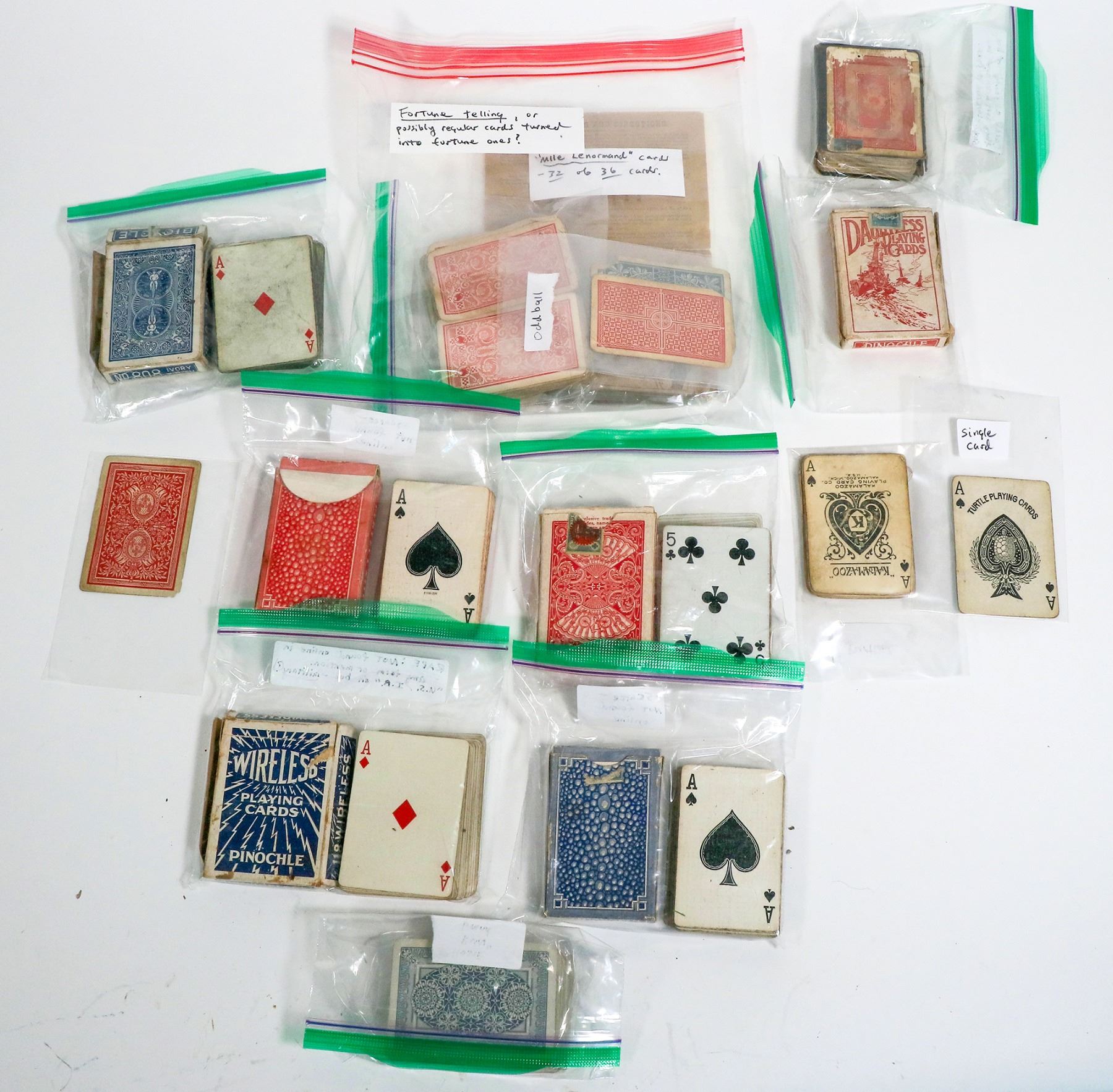 4 probably full decks of cards, several original boxes, some match cards, some do not. c. late 1800's to 1930's? Good Time Pinochle, Bicycle, Dauntless, Wireless, Bicycle etc.