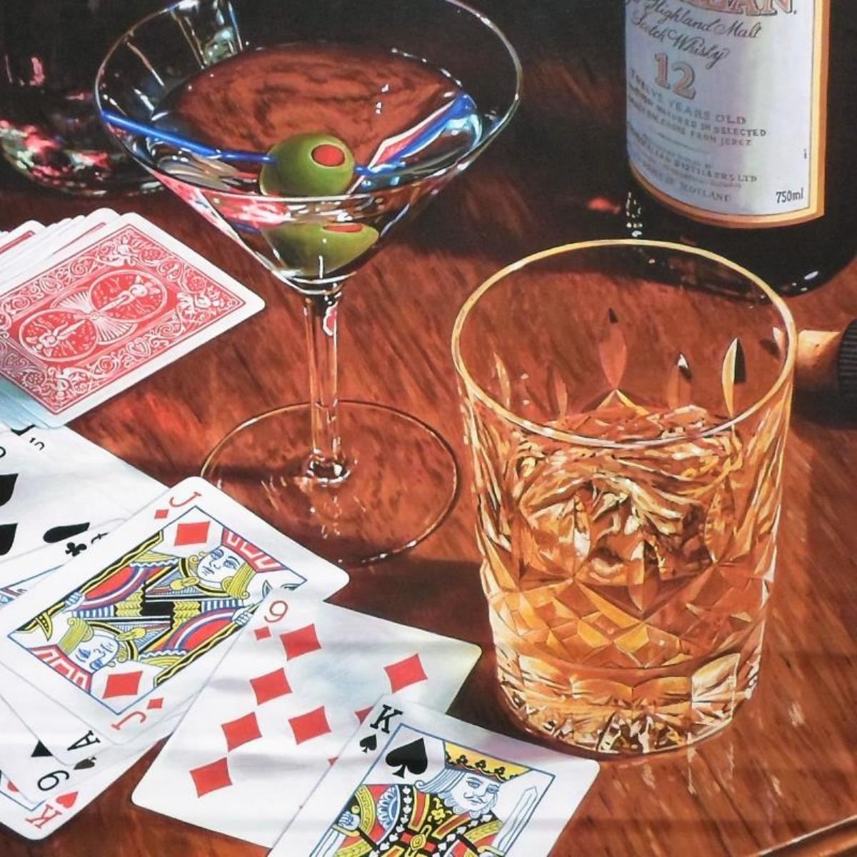 "Playing W/A Full Deck" is a numbered limited edition giclee on canvas by Nobu Hairara. It comes bearing the artist's authorized signature and with a Certificate of Authenticity. Measures approximately 30"x30" (image).