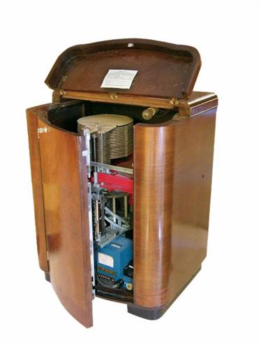 Playmaster Unit Hideaway Juke Box, built for the Spectravox lot number 1342. Designed to plug into wall boxes. Restored and in perfect working condition. 29 X 38 X 22 inches.