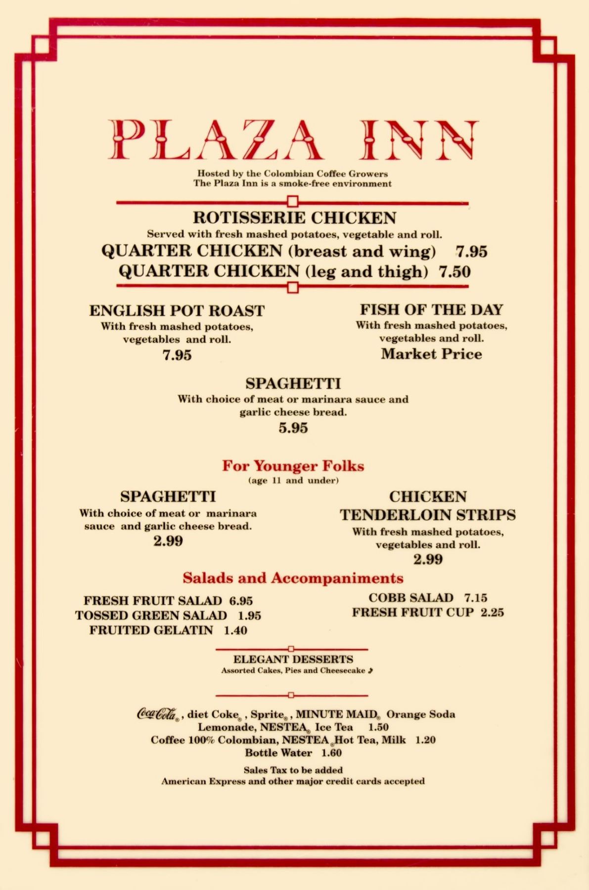 (Disneyland, c.1990s) A menu sign from the Plaza Inn at Disneyland. Below the prominently displayed name of the restaurant are the plentiful menu options listed below. The sign is constructed of acrylic board and measures approximately 30"x20". The condition is good with expected wear throughout from park use.