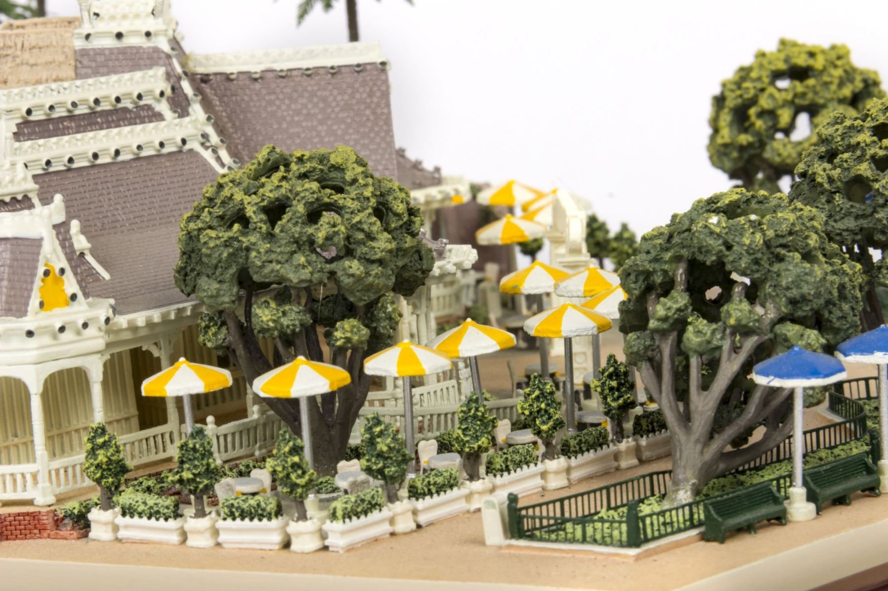 (Disneyland, 2007) An original Disneyland scale model of created by renowned miniaturist, Robert Olszewski. Depicted are the "Plaza Pavilion", "Aladdin's Oasis", and the "Enchanted Tiki Room", and these models were designed by Olszewski for Disney's incredibly popular Main Street U.S.A. Collection of miniatures. Created in resin with a wood base and a brass plaque, the model measures 14"x12" and 4" tall. There are several lighted components which can be operated by battery or electrical cord. The condition is good with minor wear from previous display. The original box is included without the inner styrofoam packaging. Given that these miniatures have numerous fine details, there may be a small chip, crack, or break that may have gone unnoticed. Please use the images of the item to help assess the full condition.