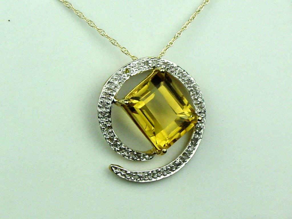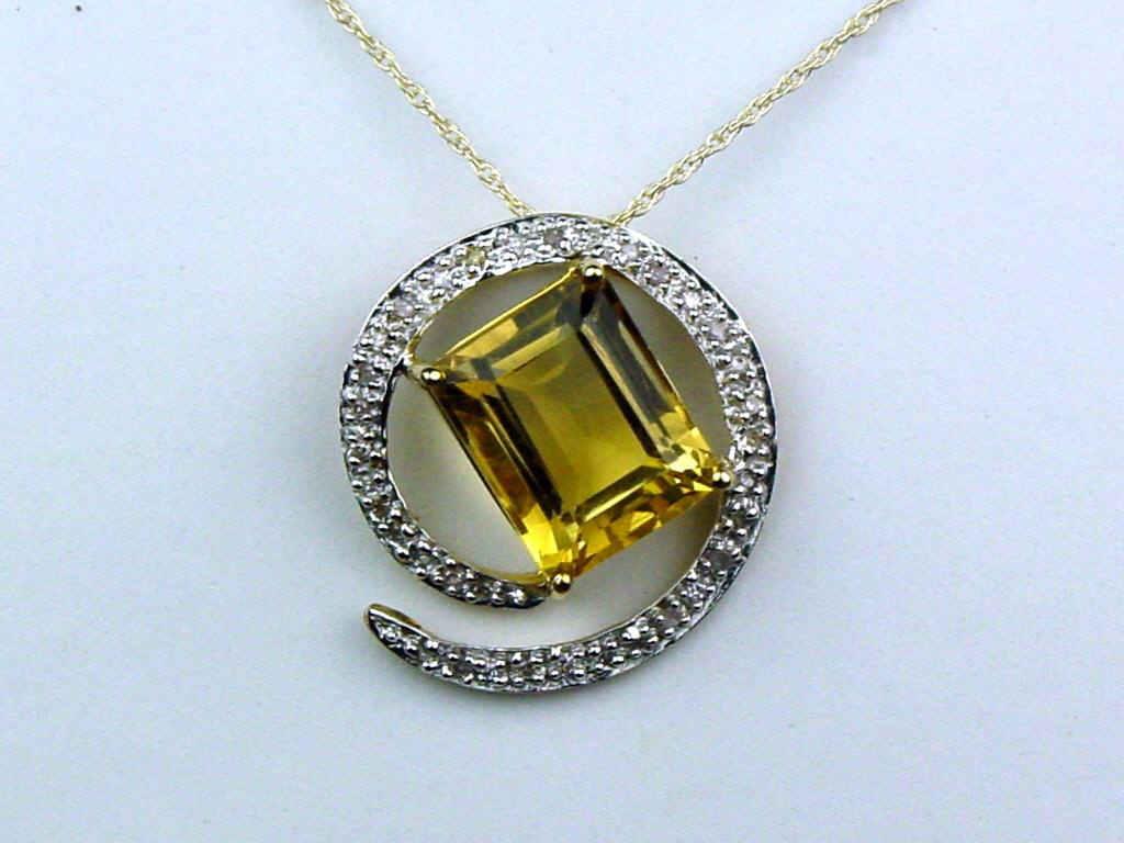 Pleasant 10K Yellow Gold Ladies Pendant Set with a center emerald cut Citrine weighing approx. 3.00 carats and pave set with 35 round diamonds weighing approx. 020 carats of H-I colors. Retail: $1,350.00Set with a center emerald cut Citrine weighing approx. 3.00 carats and pave set with 35 round diamonds weighing approx. 020 carats of H-I colors. Retail: $1,350.00