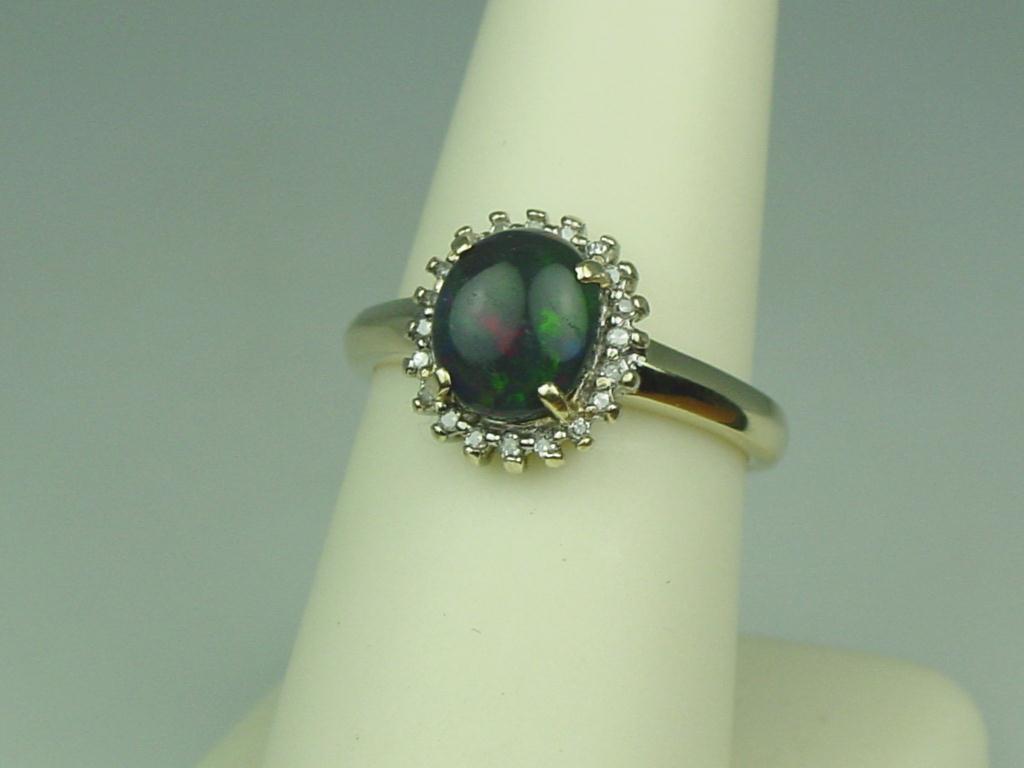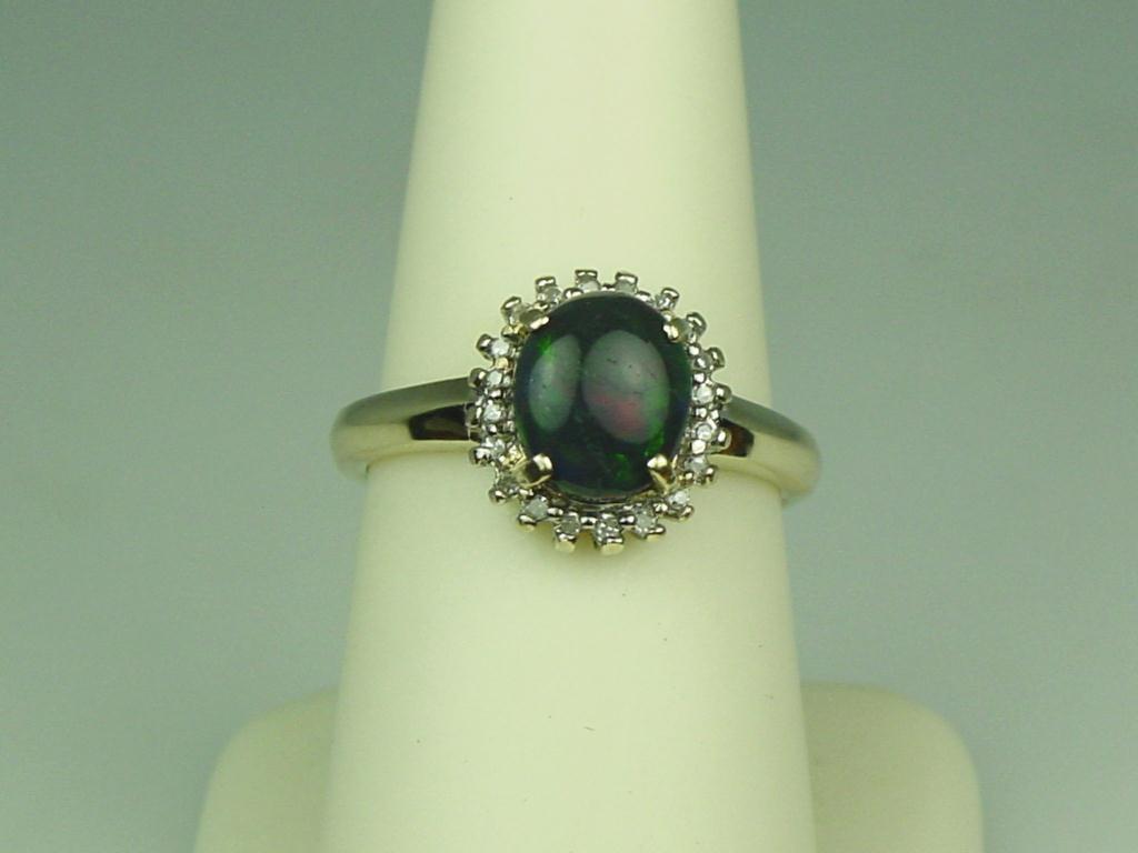 Pleasant 10K Yellow Gold Ladies Ring Set with a center Australian black Opal weighing approx 2.0 carats and surrounded by 22 round diamonds weighing approx 0.15 carats. Retail: $1,450.00Set with a center Australian black Opal weighing approx 2.0 carats and surrounded by 22 round diamonds weighing approx 0.15 carats. Retail: $1,450.00