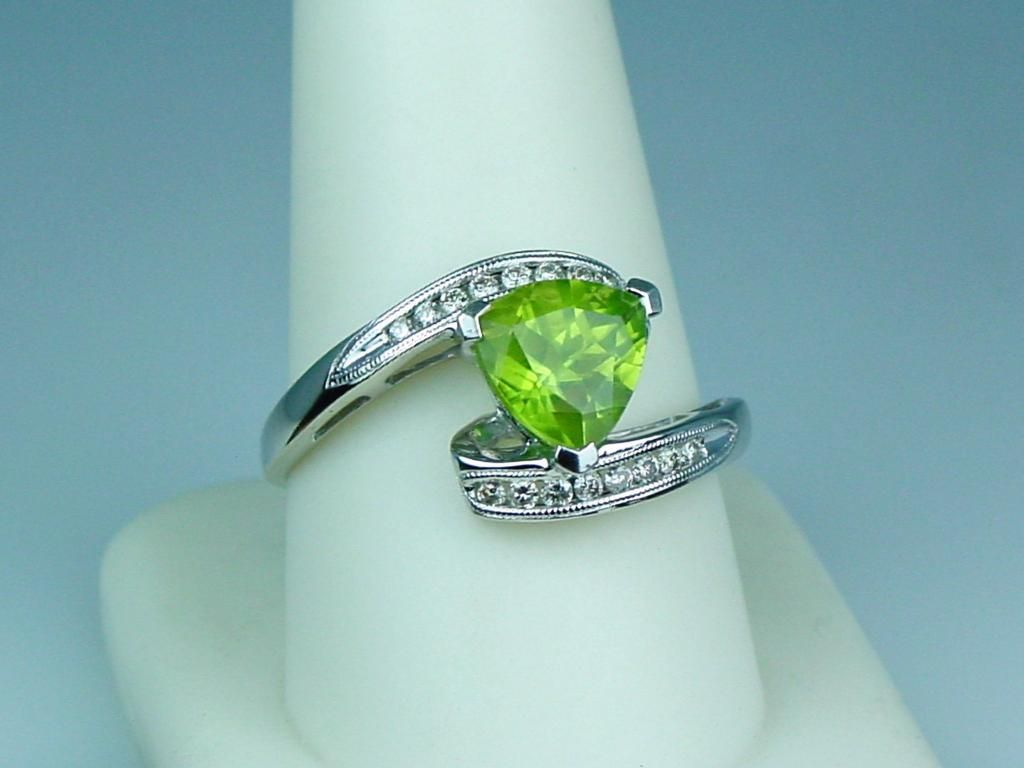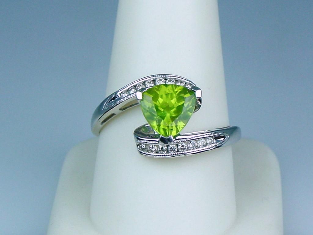 Pleasant 14 karat white gold ladies by-pass design ring set with a trilliant cut peridot weighing approx. 2.00 carats and channel set with 16 round brilliant cut diamonds weighing approx. 0.30 carats of F-G colors and VS/SIclarity. Retail $1,650.00 Estimate $600-$800