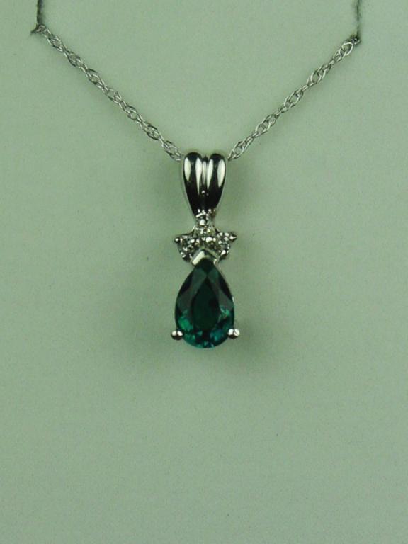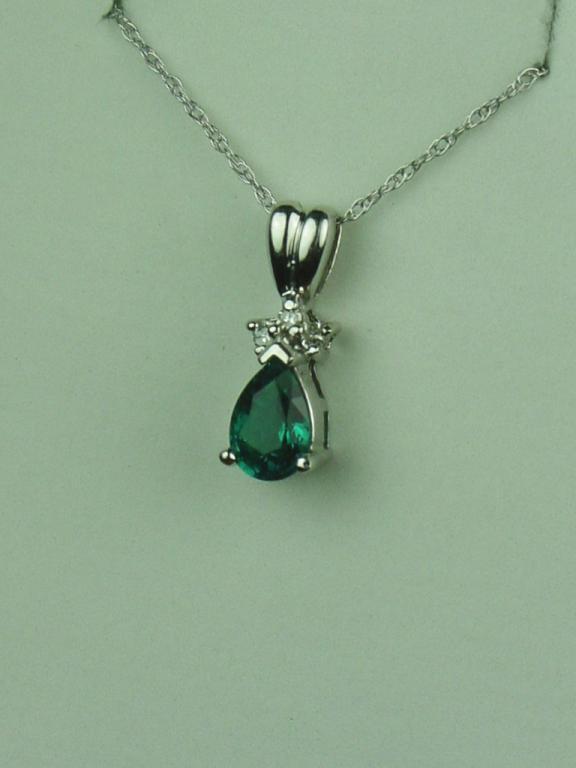 Pleasant 14 karat white gold ladies pendant set with a pear shape Chatham created emerald weighing approx. 0.80 carats and side diamonds. Retail $995.00 Estimate $200-$400
