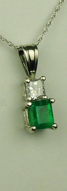 Pleasant 14 karat yellow gold ladies handmade pendant set with an intense green Colombian Emerald weighing 0.55 carats and side princess cut diamonds weighing 0.25 carats of D/E color and SI clarity. Retail $2,350.00Estimate $800-$1,200