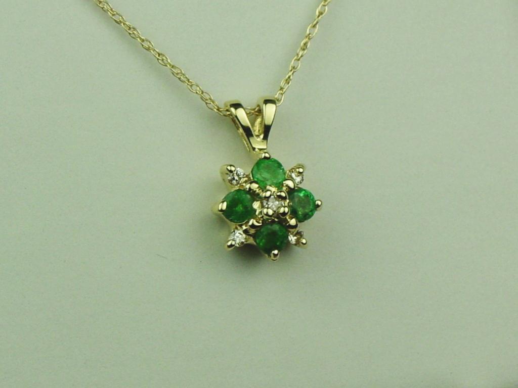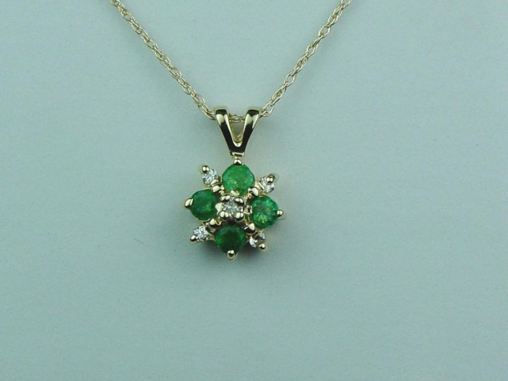 Pleasant 14K YG Ladies Flower Design Pendant Set with fine quality emerald and diamonds weighing approx. 0.50 carats. Retail: $750.00Set with fine quality emerald and diamonds weighing approx. 0.50 carats. Retail: $750.00
