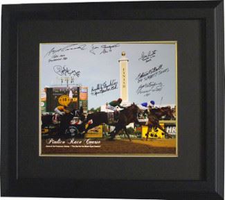 The Preakness Stakes is a thoroughbred horse race held on the third Saturday in May each year at Pimlico Race Course in Baltimore, Maryland. It is a Grade I race run over a distance of 9.5 furlongs on dirt. Colts and geldings carry 126 pounds; fillies 121 lb. It is the second leg of the US Triple Crown, following the Kentucky Derby and followed by the Belmont Stakes. The race has been termed "The Run for the Black-Eyed Susans" because a blanket of yellow flowers altered to resemble the Maryland State flower is placed around the winner's neck. Attendance at the Preakness Stakes ranks second in North America only trailing the Kentucky Derby. This 16x20 Photo is signed by 7 winners of the Preakness Stakes each with horse and year: 1977-Horse-Seattle Slew, Jockey-Jean Cruguet---1979-Horse-Spectacular Bid, Jockey-Ronnie Franklin---1981-Horse-Pleasant Colony, Jockey-Jorge Velasquez--- 1984-Horse-Gate Dancer & Codex 1980 , Jockey-Angel Cordero---1989-Horse-Sunday Silence, Jockey-Pat Valenzuela---2003-Horse-Funny Cide, Jockey-Jose Santos---2004-Horse-Smarty Jones, Jockey-Stewart Elliott---MAB Hologram and Certificate of Authenticity from Athlon Sports. Custom Black Mat and Premium Black Frame as shown.