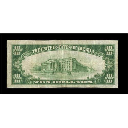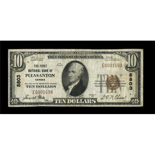 <B>Pleasanton, KS</B></I> - $10 1929 Ty. 1 <B>The First NB</B></I> Ch. # 8803<BR> A very rare note from the only issuer in Linn County. This was one of the smallest banks in the state, operating with a capital of just $12,500, and issuing a mere $95,000 in currency during its 28 year issuing period. This piece is the Lyons collection example, which sold back in 1995 for $500. The Kelly census shows just one large and three small examples extant from here. Nice <B>Very Fine.</B></I><BR><I>From The J.S. Weber Collection.</B></I><BR><BR><b>Shipping:</b> Coins & Currency (<a target="_blank" href="http://www.heritageauctions.com/common/shipping.php">view shipping information</a>)