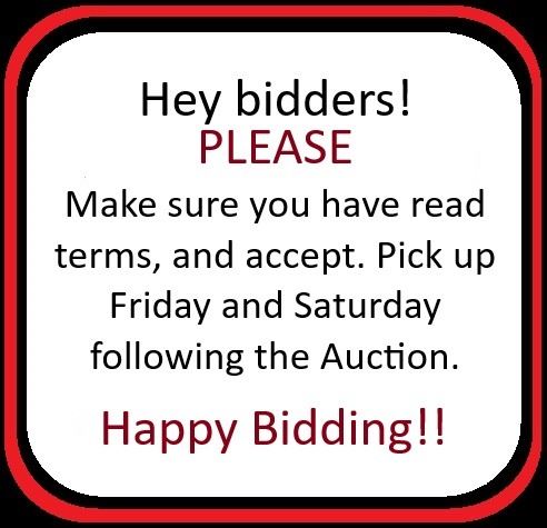 Please make sure to read and review all terms and condtions as well as the bidder increments, shipping information and all other relevant information prior to bidding. once you've read and understood all such items, sign on up and get bidding! We're excited to have you join us for our auction. Thanks for being here, have a good time.