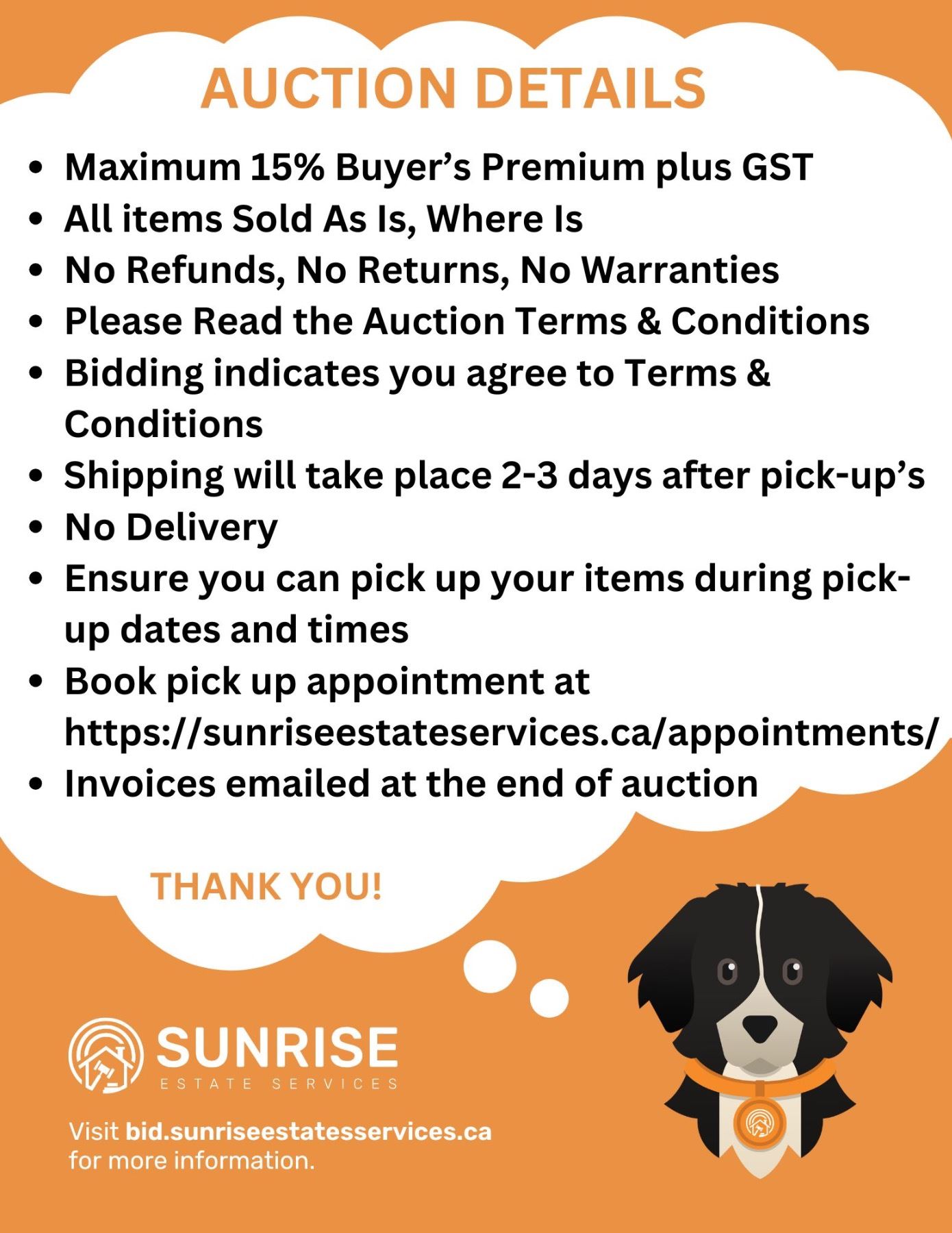 -Items must be picked up on April 7th and 8th between 10am-6pm, please book a pick up appointment at www.sunriseestateservices.ca