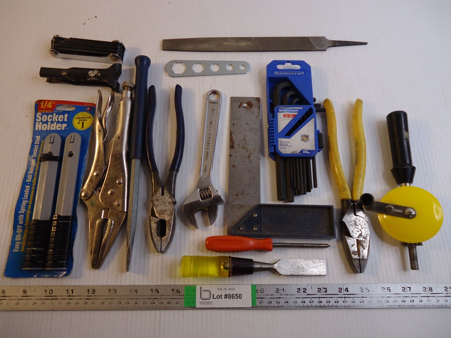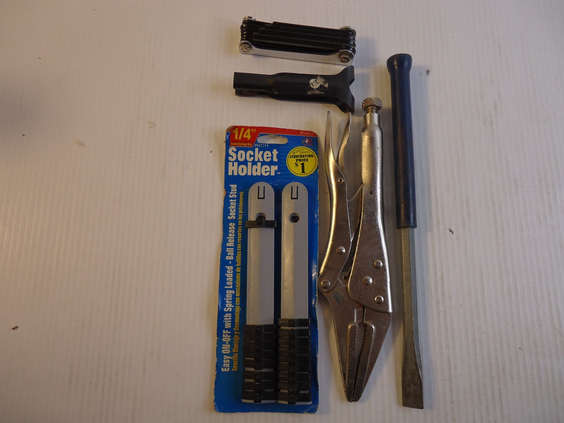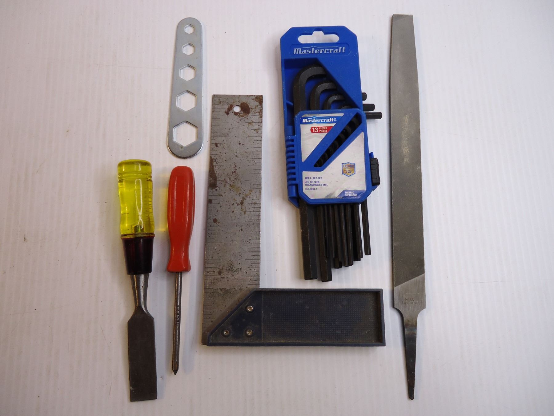 Pliers, Hex key Set, Socket Holder, Square, Chisels and more as pictured