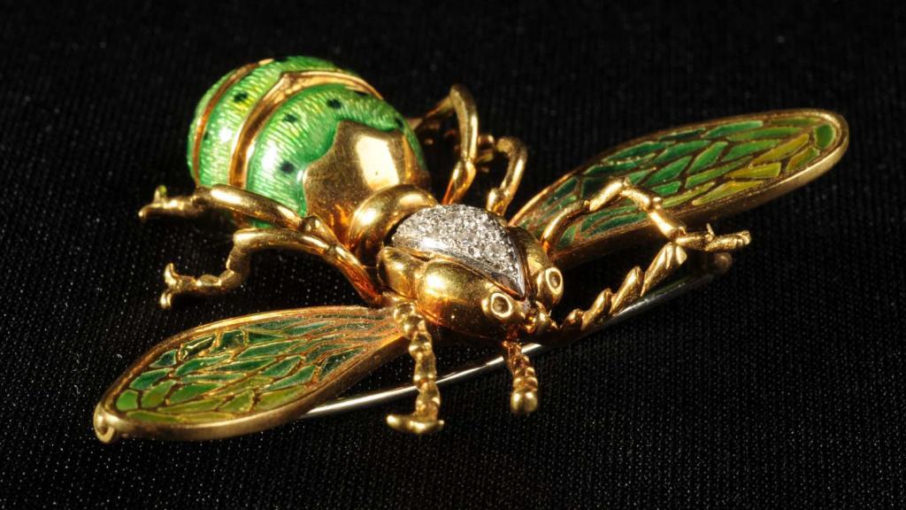 Fabulous, one-of-a-kind pin that is beautifully enameled and done in 18 karat yellow gold. There is very unusual, highly skilled and labor intensive plique-a-jour work with small individual pieces of green glass in between the gold on the wings of the wasp. This process was first used in France in the 1920s. There are 11 round brilliant cut diamonds (G-H/VS2) and very fine enameling work. This piece is probably from the 1960s and is in perfect condition. This is a one-of-a-kind piece that demonstrates the beauty of nature. Jewelry