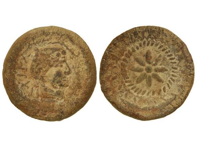 Plomo monetiforme. MALACA. Anv.: Cabeza de Vulcano a derecha con gorro cónico, detrás leyenda neopúnica. Rev.: Estrella de ocho puntas gruesas con glóbulo central dentro de una gráfila de líneas radiales. 29,80 grs. Similar a moneda Vill-6 p