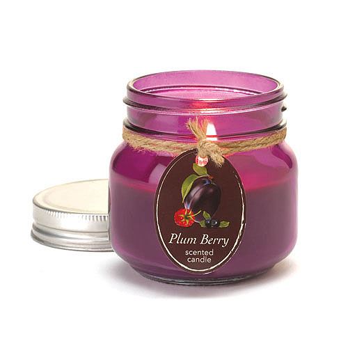 Plum Berry Mason Jar Candle **|**|** Juicy, ripe plums and berries mix together to create an aroma that will freshen your room with the perfect summer scent. This soy-blend mason jar candle instantly makes any room cozy. 5 oz. and burns up to 25 hours. Item weight: 0.6 lb. 3 x 3" x 3-1/4" high. Soy blend and paraffin wax in a glass jar with metal lid."
