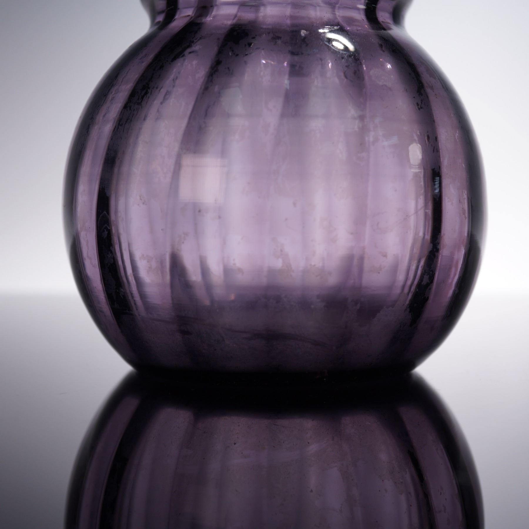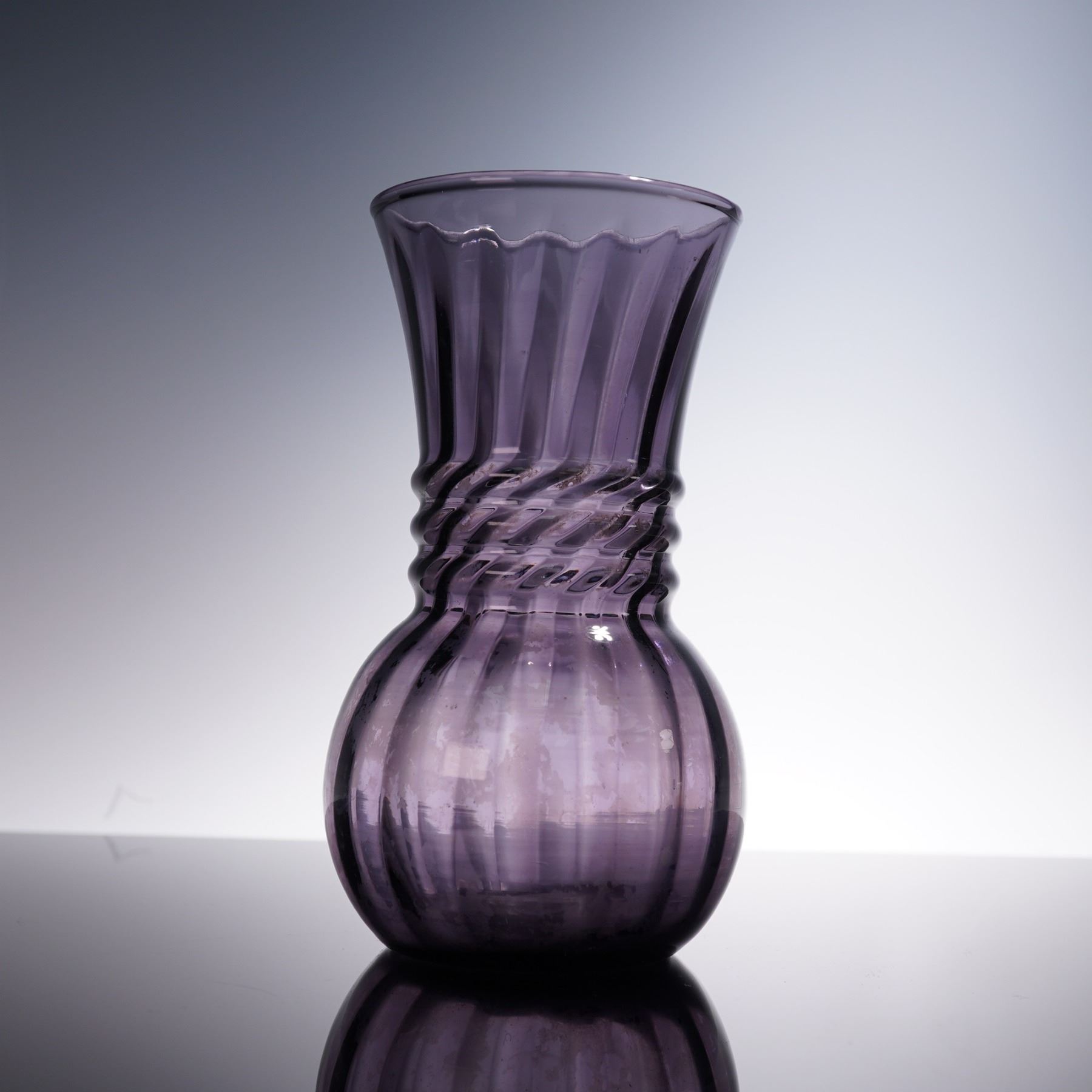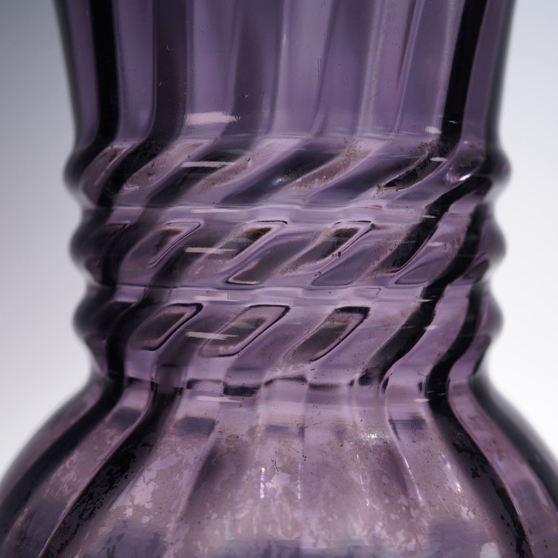 Hand-blown optic swirl glass vase in rich plum purple. Features ribbed vertical fluting with a twisted waist and bulbous base, finished with a polished pontil. A striking decorative piece with a luminous tone and classic form, perfect for display or floral use.