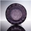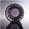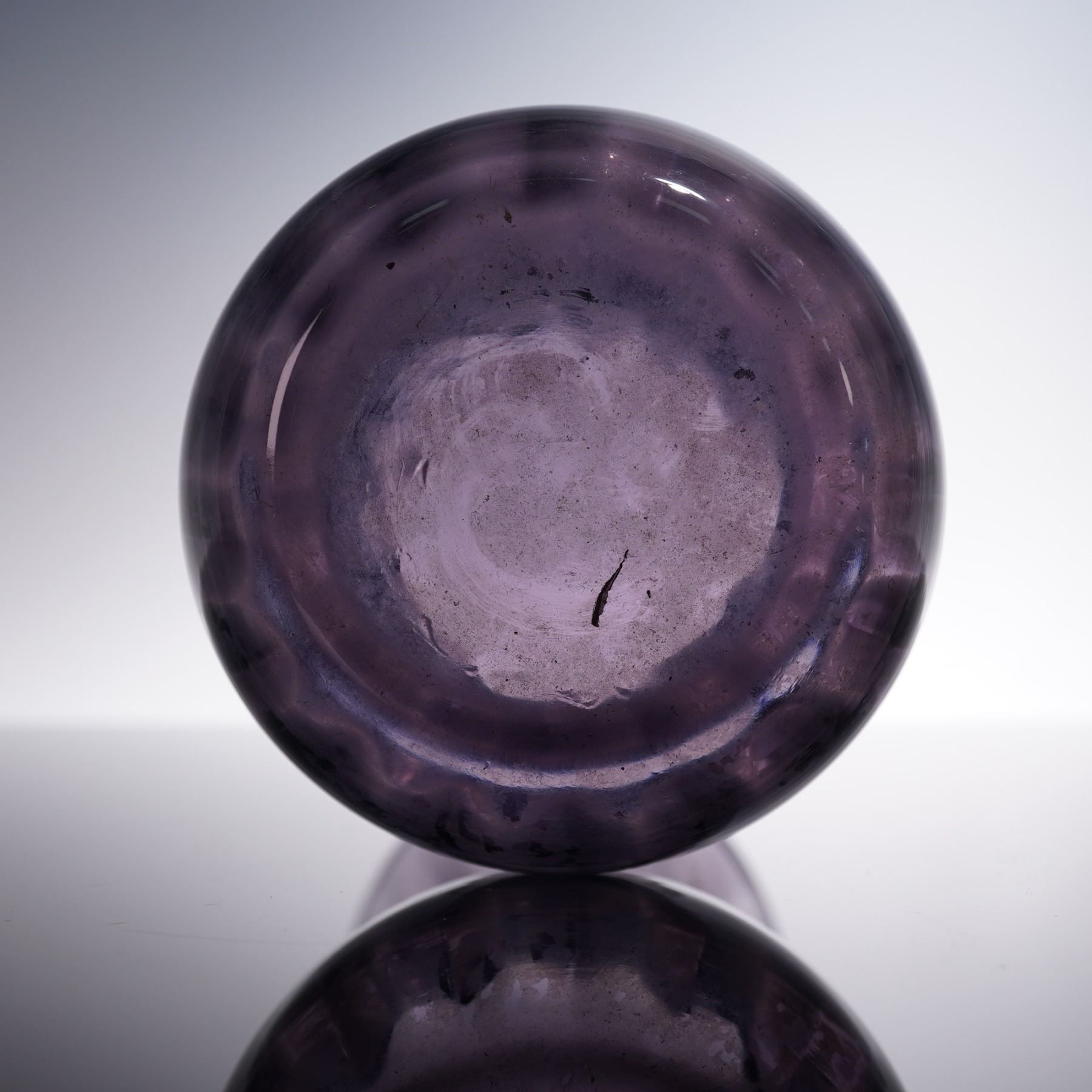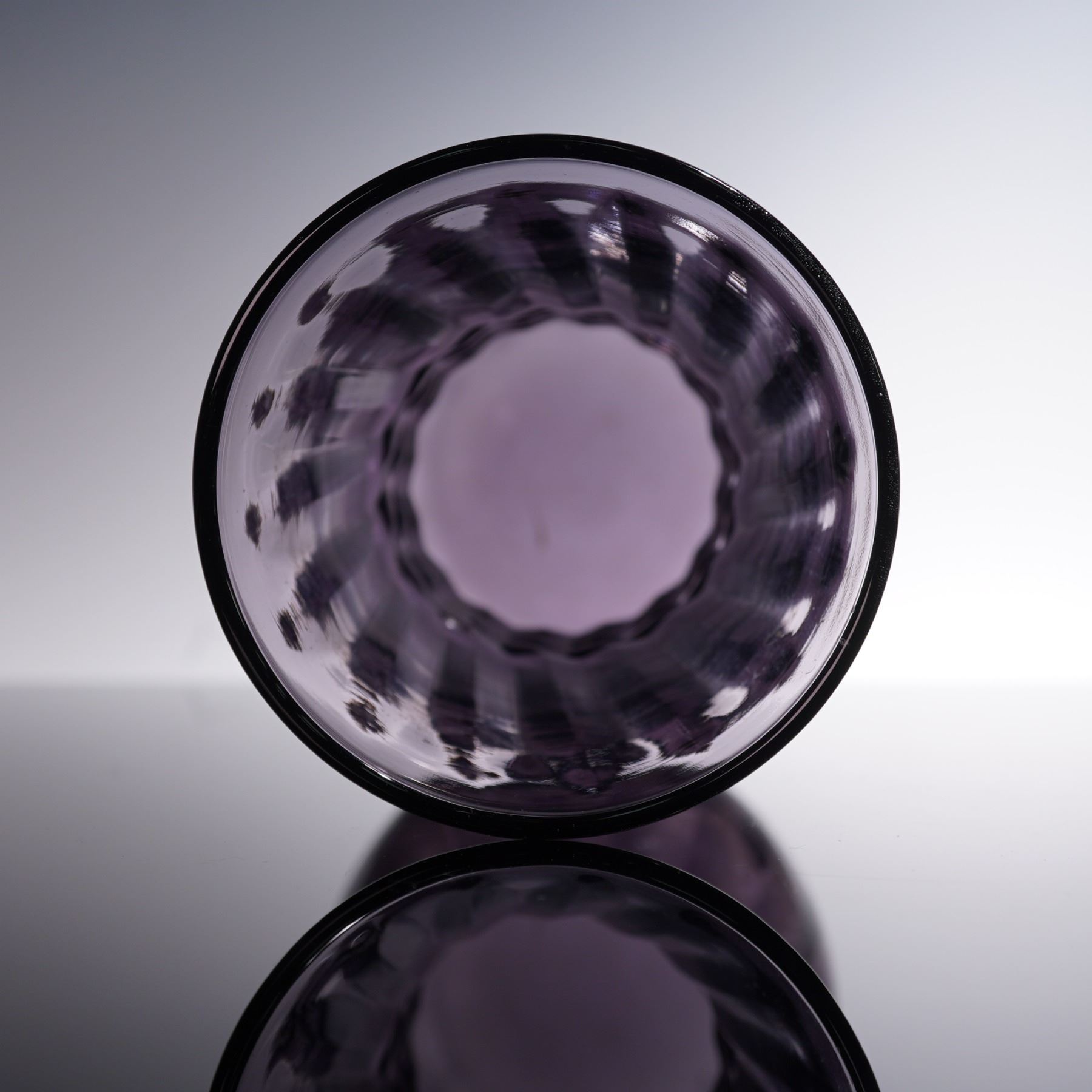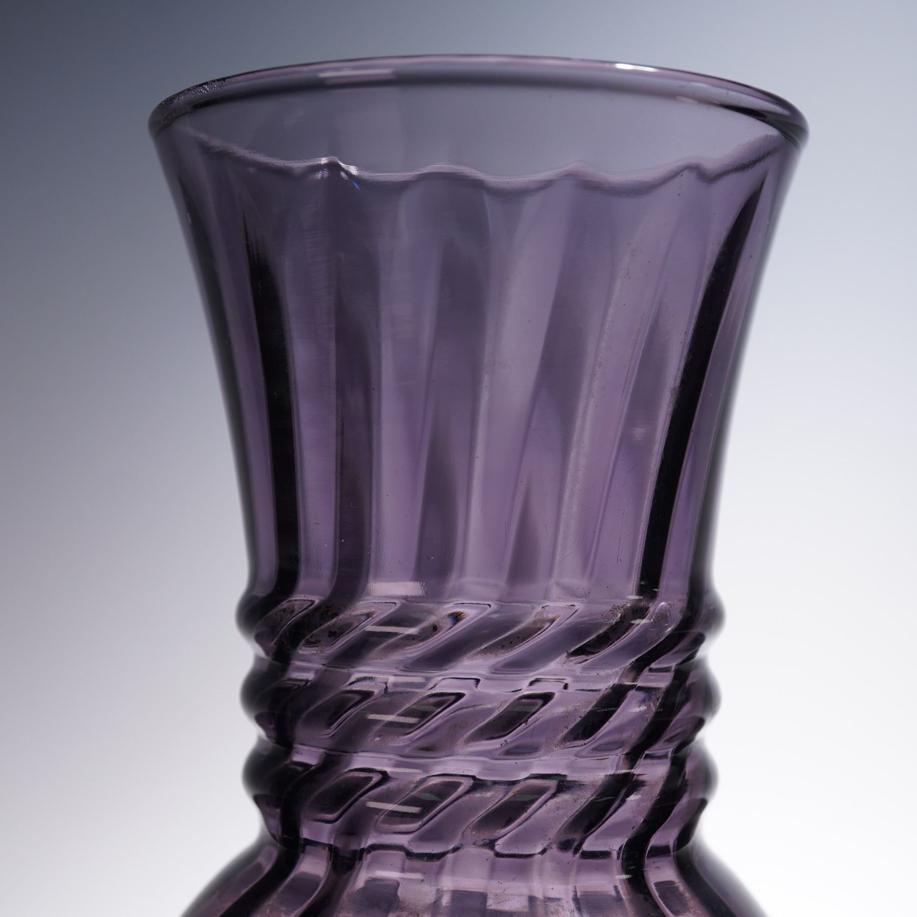 Hand-blown optic swirl glass vase in rich plum purple. Features ribbed vertical fluting with a twisted waist and bulbous base, finished with a polished pontil. A striking decorative piece with a luminous tone and classic form, perfect for display or floral use.