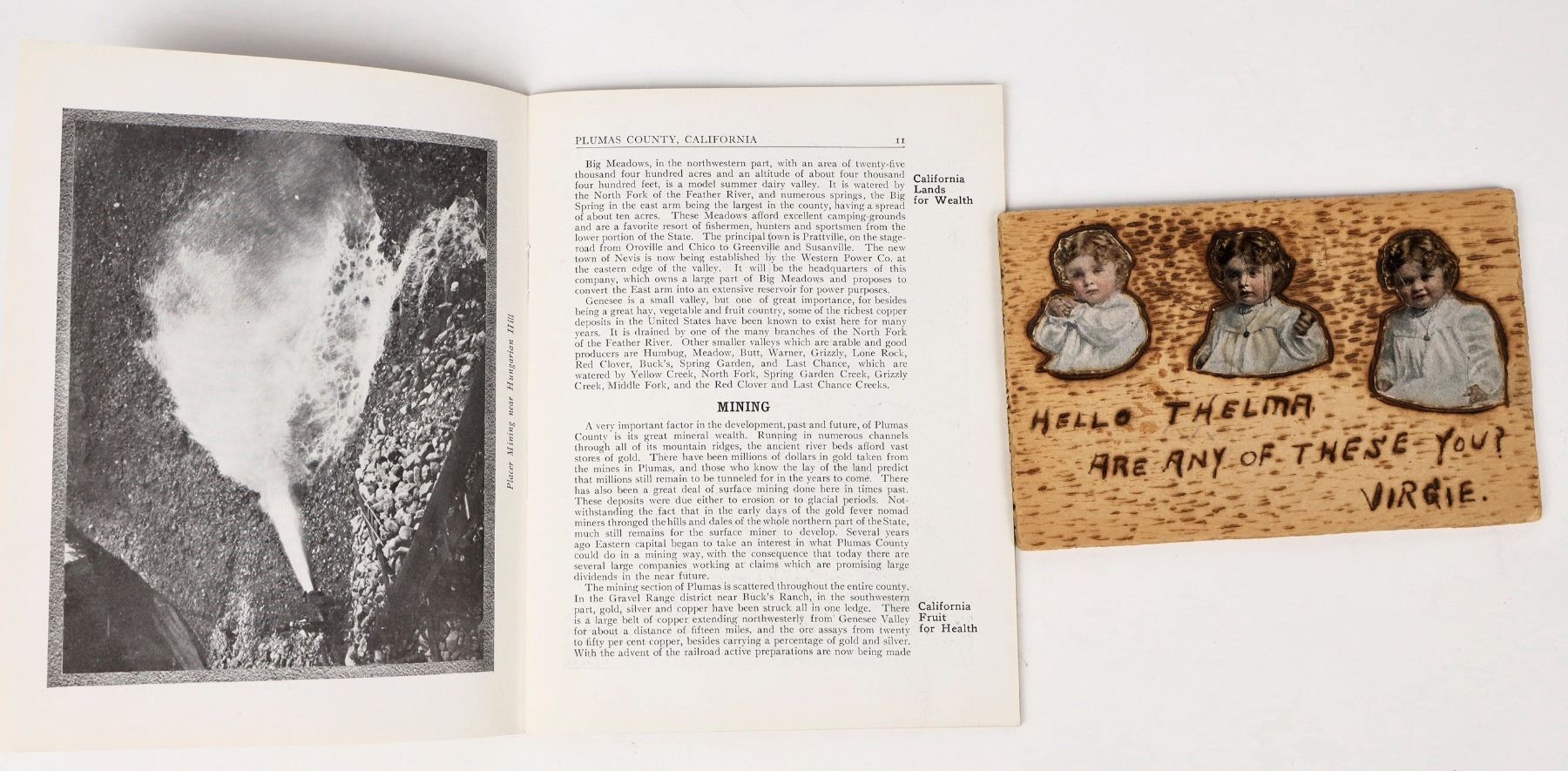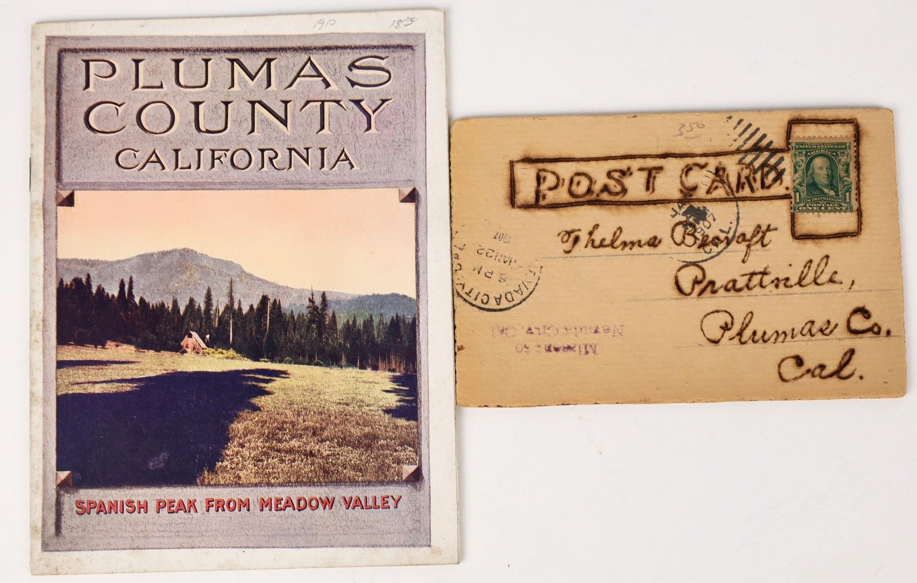 Lot of (2) early Plumas Co. items. First is a 1910 Plumas County General illustrated Guide from Sunset Magazine. Authored by G. Yoell Parkhurst, it contains the history of the region, its wealth and agriculture, mining and lumber, railroads, towns and even hot springs. Photos on most of the 32 pages. Second is an unusual post card, hardboard made to look like wood. 1c stamp, cancellation reads 1907. Add to your unique collection!
