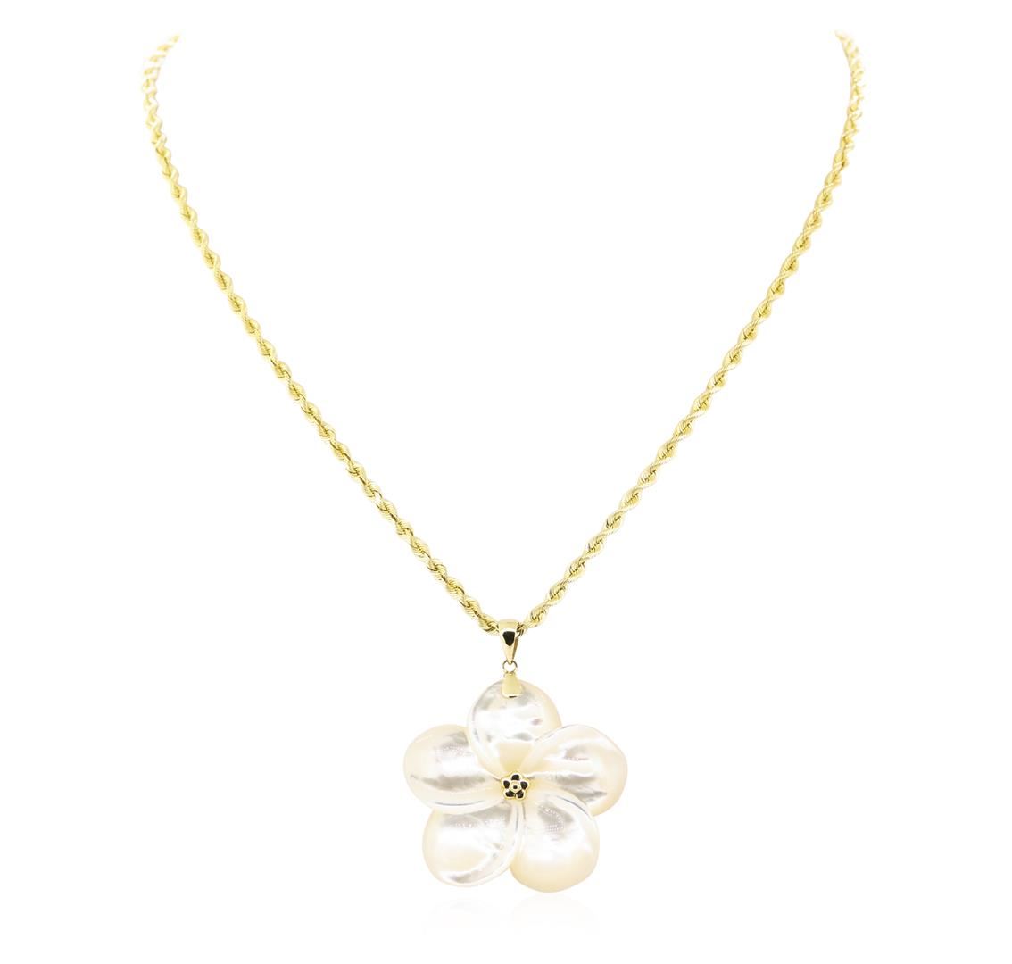 One plumeria shaped pendant with an attached 18 inch long 3mm diamond cut rope link chain featuring: 14KT yellow gold weighing 16.8 grams containing one piece of hand-carved mother of pearl.