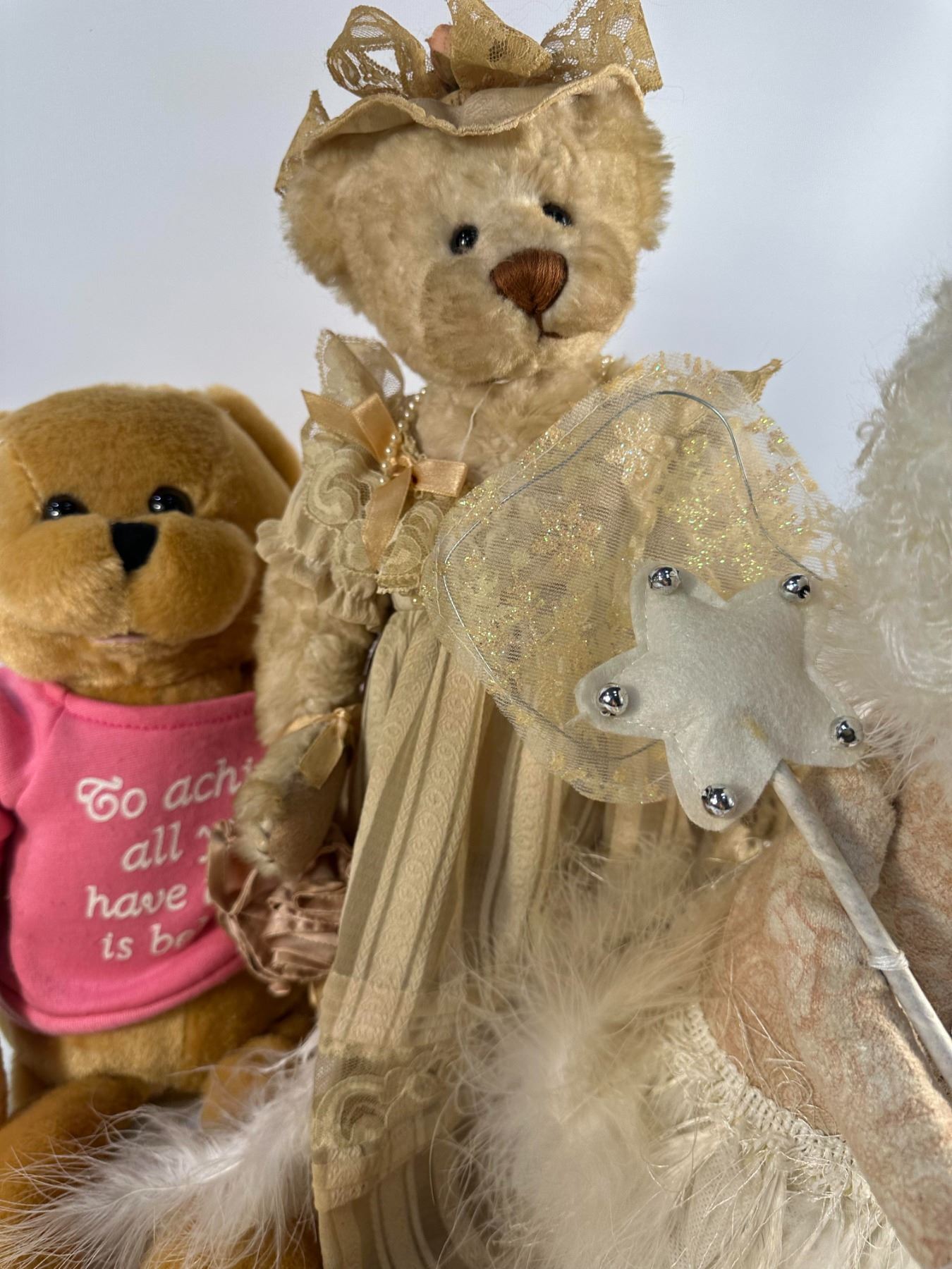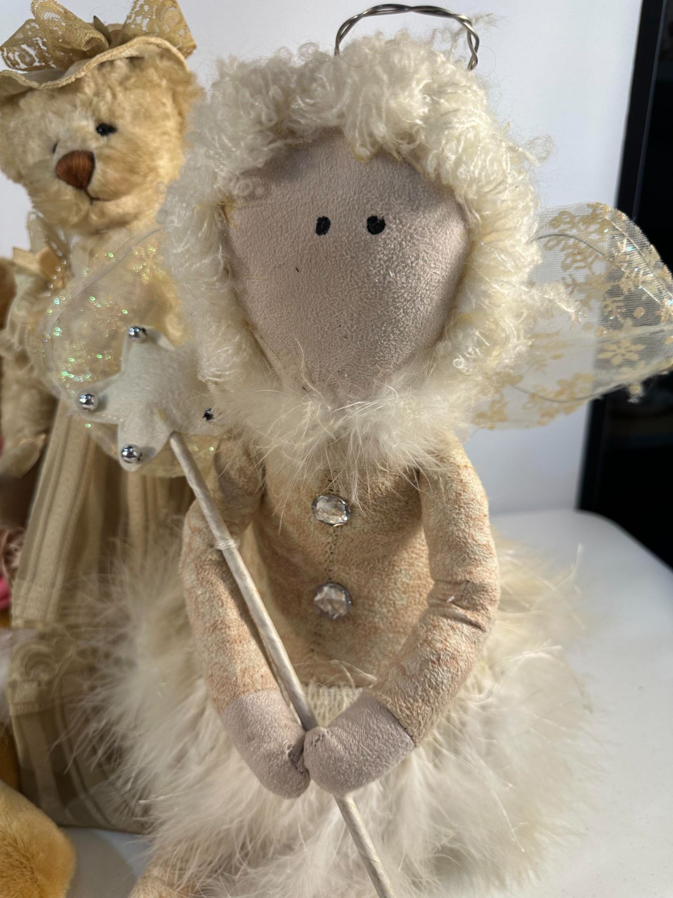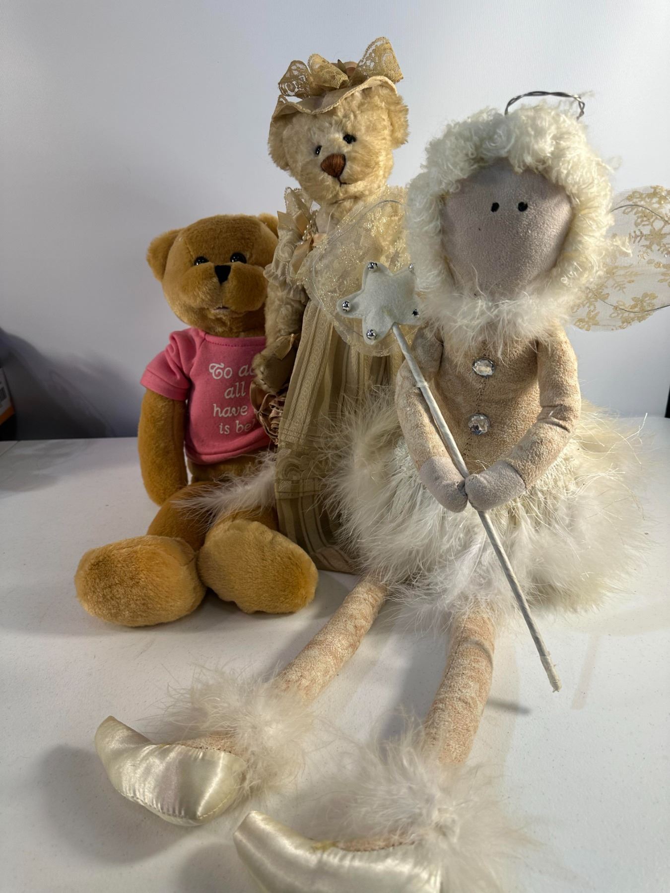 Plush teddy in pink shirt, dressed bear in lace gown, and whimsical long-legged angel doll with wand and wings. Good overall.