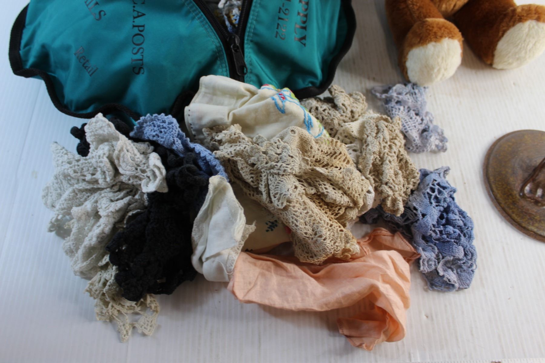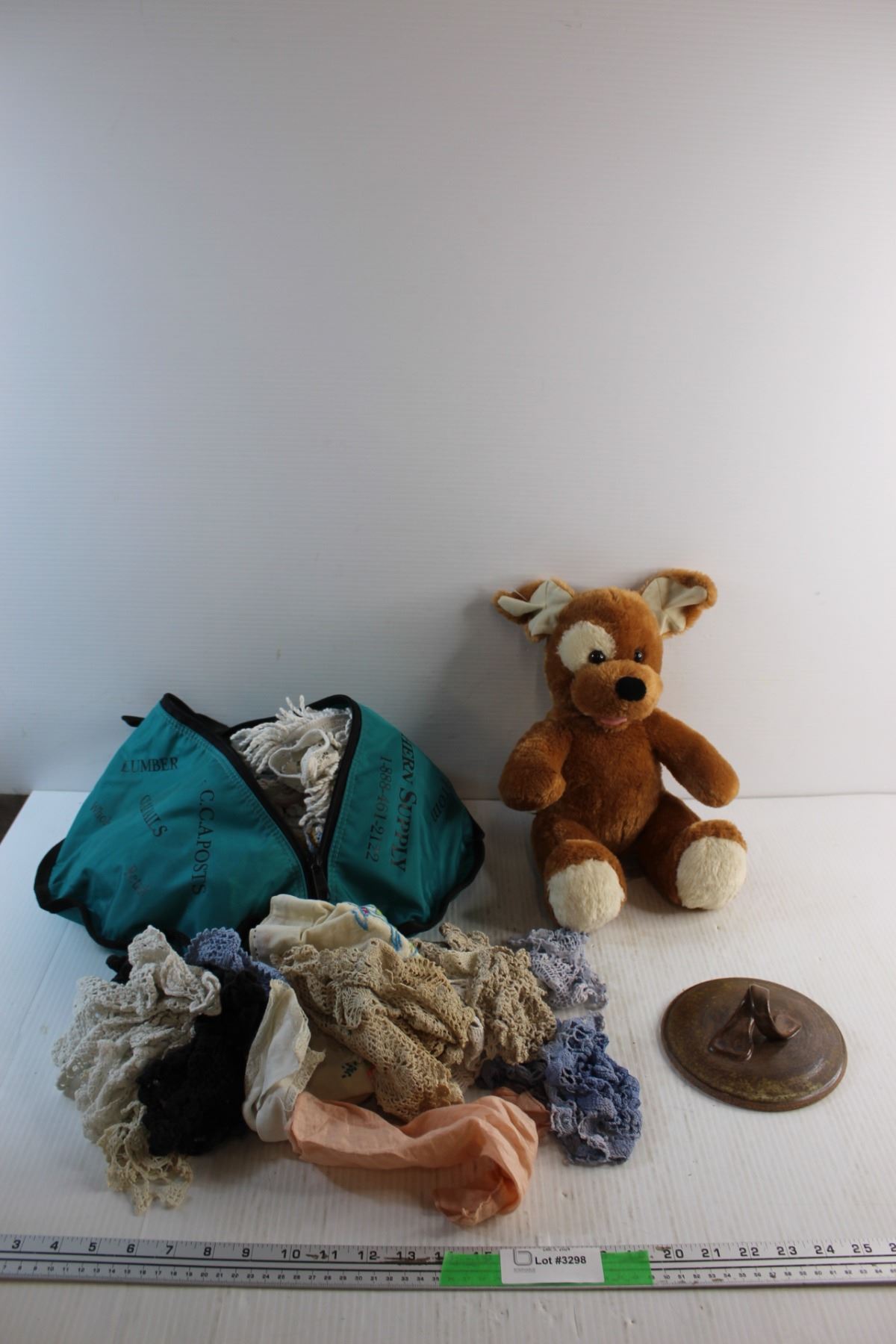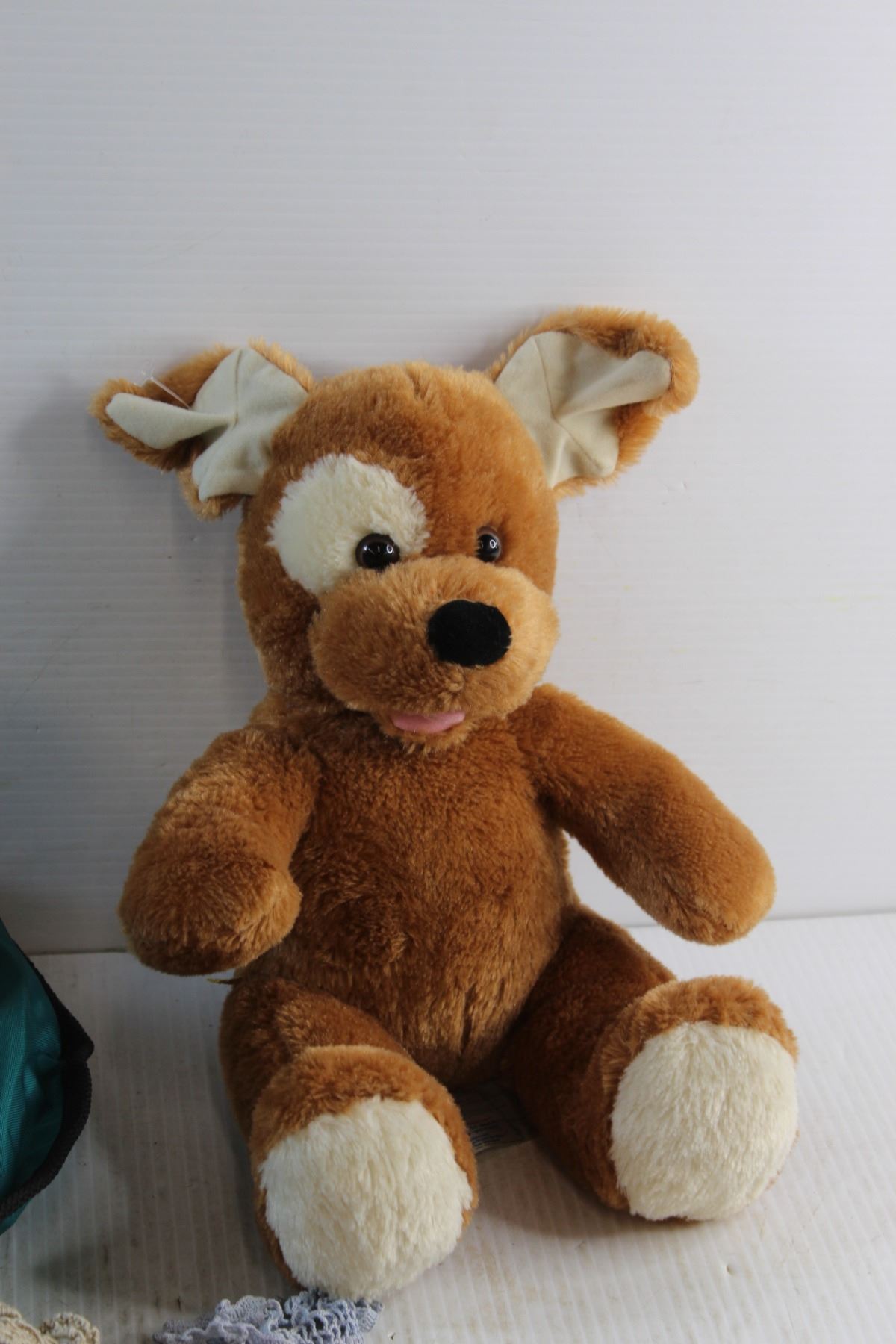 Plush Puppy, Fabric Scraps and Ceramic Pot Lid 6''