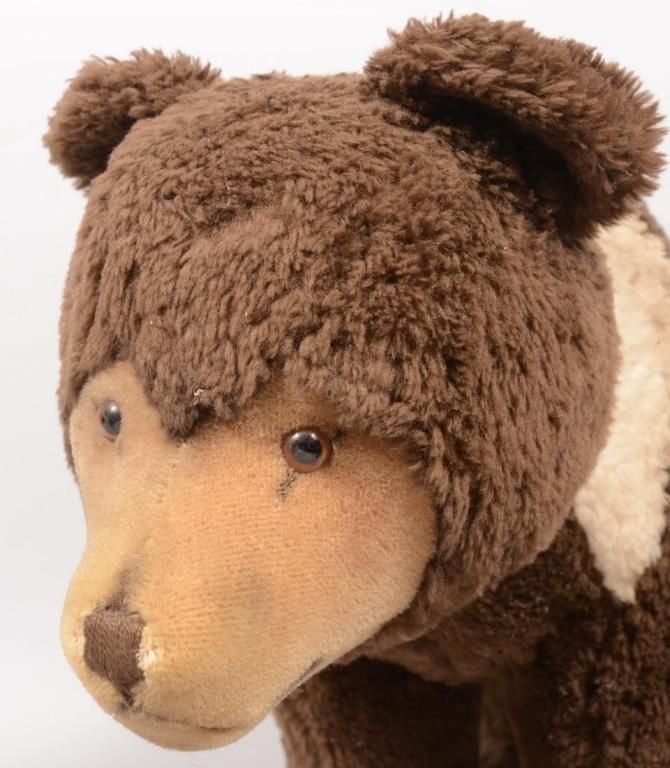 Plush Ride able Toy Brown Bear on Wheels. Dark brown fur with tan face and shoulders, glass eyes and thread nose and mouth. Loop handle protrudes from top of back at neck. Bear mounted on a heavy wire frame with stationary axle rear wheels.
