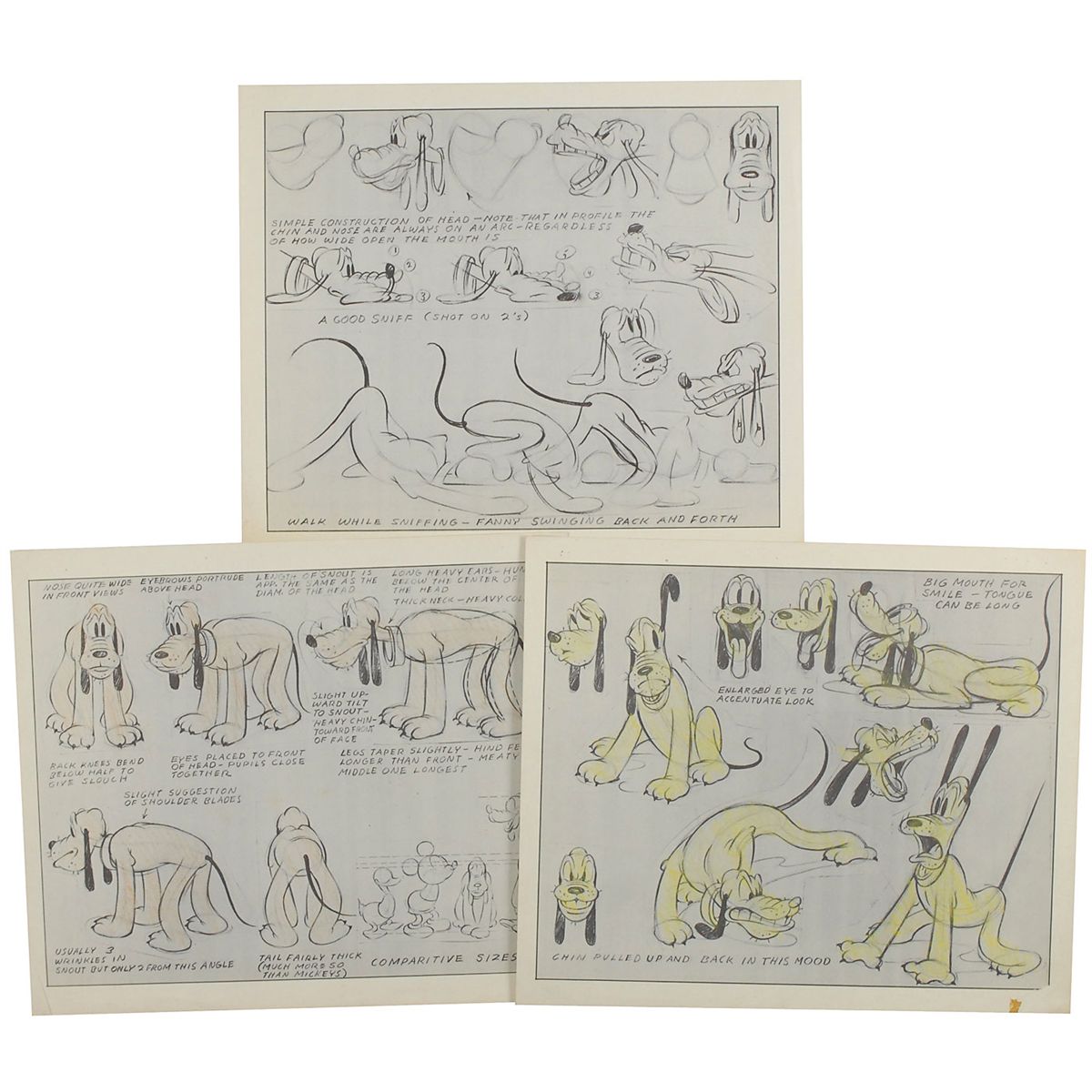 (Walt Disney Studios, Circa 1938) Three original stat model sheets of Pluto from circa 1938, featuring him in many different moods, positions, and movements. Sheets measure 12 x 10. In overall fine condition.