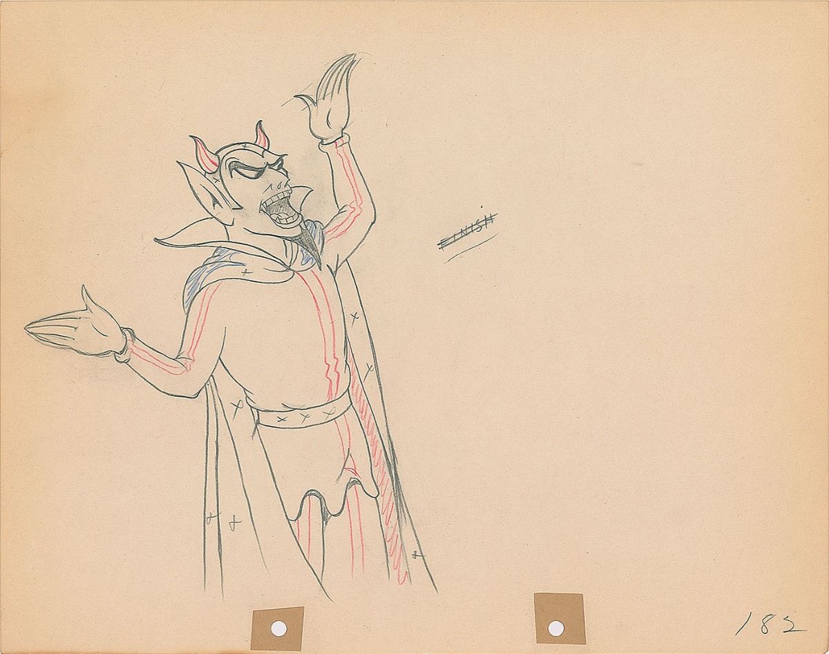 (Walt Disney Studios, 1934) Original production drawing featuring Pluto, God of the Underworld, from the Silly Symphony short The Goddess of Spring, showing the devilish ruler of Hell with his arms in the air. Accomplished in graphite and colored pencil on untrimmed 12 x 9.5 animation paper. Image measures 5.5 x 8. In fine condition.