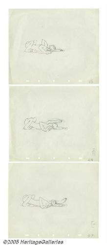 <B>Pluto Production Drawings Group of 3 From the 1940s.</B></I> Mickey's faithful pet dog Pluto starred in 48 of his own cartoons, and also appeared along with Mickey Mouse and Donald Duck in many of their 'toons. Created as an actual dog character, with no speaking voice, as opposed to Goofy, who was created as a human character, the dog who would eventually evolve into Pluto made his debut as a bloodhound in the Mickey Mouse cartoon "The Chain Gang" (1930). Later that year he appeared as Minnie Mouse's dog Rover, in "The Picnic," and the following year finally became Mickey's dog Pluto in "The Moose Hunt." Featured are three animation sketches of Pluto from an unknown production, numbered "15," "23," and "27." All are in great condition, with only faint wrinkling and tanning.