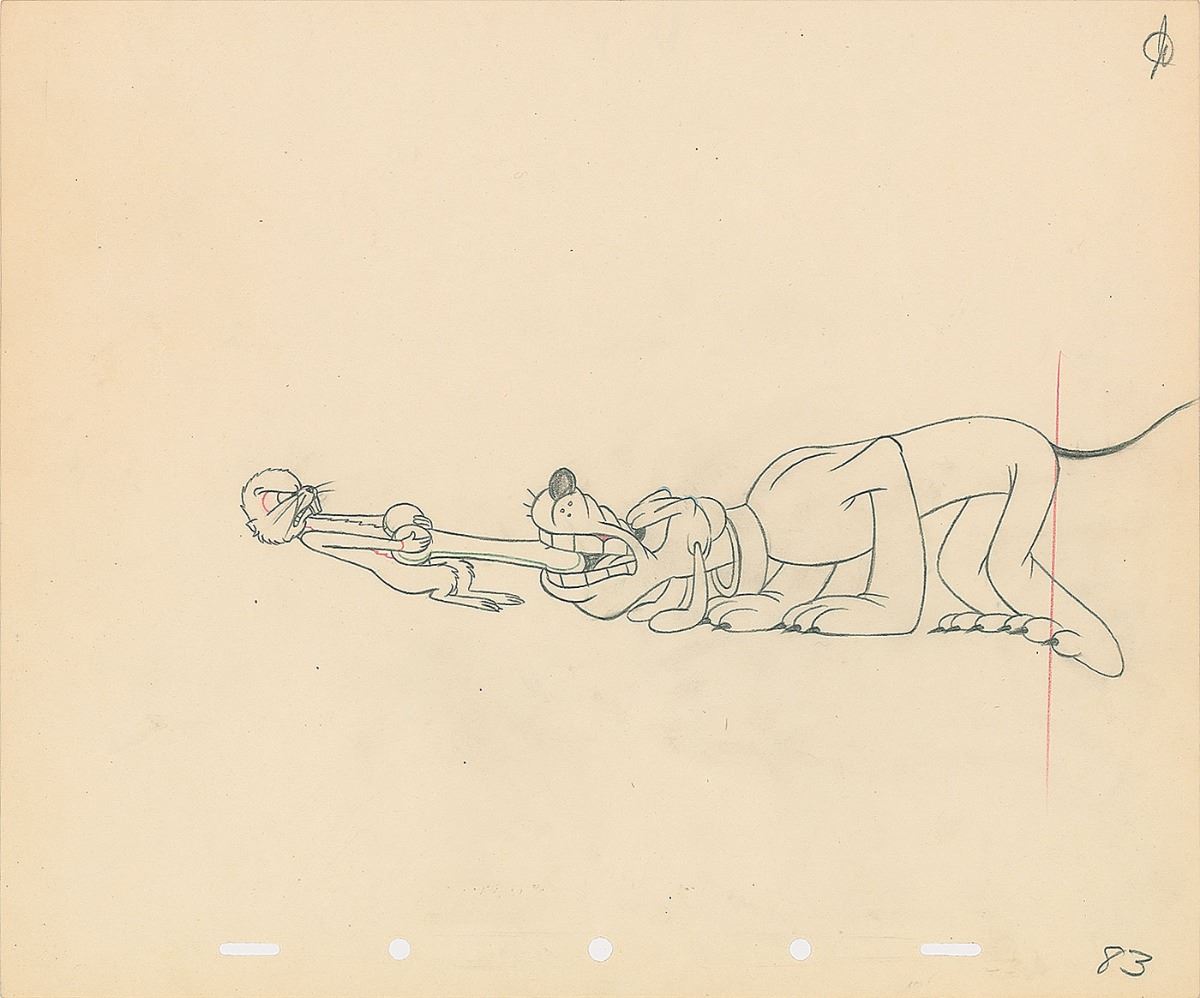 (Walt Disney Studios, circa 1942–1945) Original production drawing featuring Pluto and a gopher fighting over a bone. Accomplished in graphite on untrimmed 12 x 10 animation paper. Image measures 9.5 x 2.5. In fine condition.
