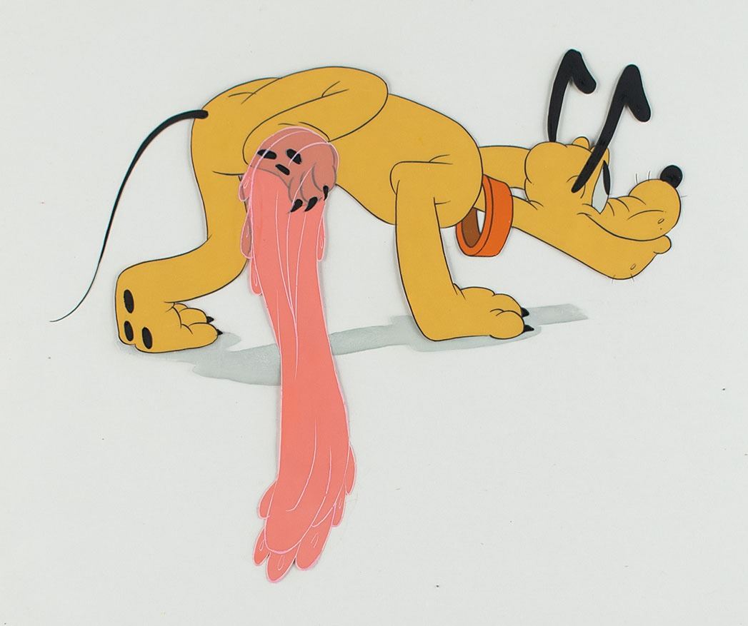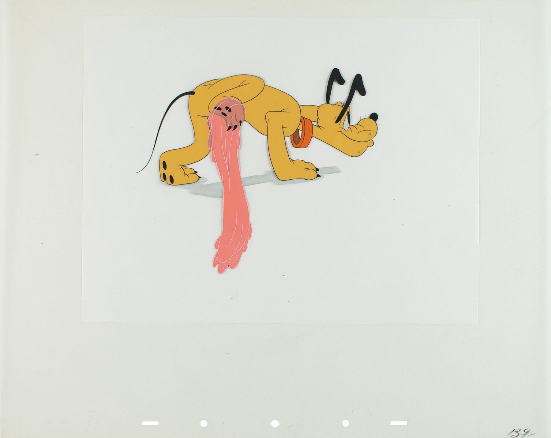 (Walt Disney Studios, 1943) Original production cel featuring Pluto from a Disney short, which shows Mickey's canine pal in a full-figure pose with gum stuck to his paw. Image measures 7 x 5.5, with overall dimensions of 15.25 x 12.5, and the lower right corner marked "139." In fine condition.
