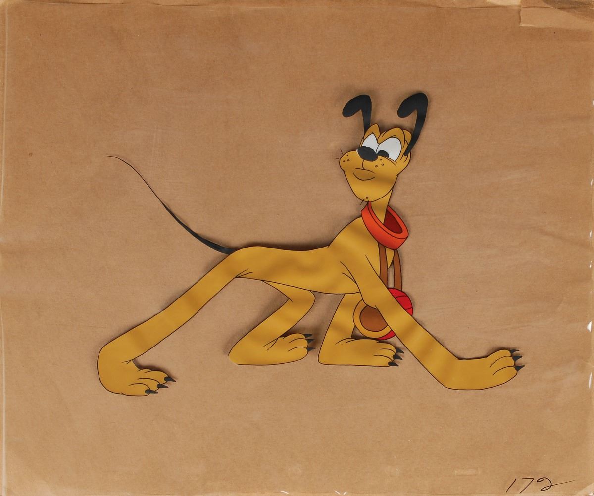 (Walt Disney Studios, circa 1939–1940) Original production cel featuring a full-figure pose of Pluto from a Disney cartoon on a full cel. Image measures 8.5 x 6, with overall dimensions of 11.75 x 10. In fine condition.