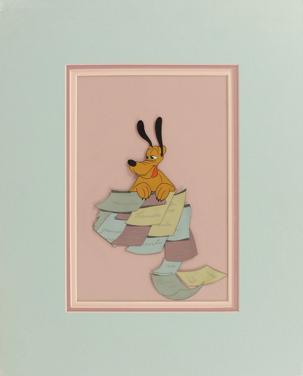 (Walt Disney Studios, circa 1951–1953) Original production cel featuring Pluto with a pile of notes from a Disney cartoon. Image measures 5 x 7.25, with a mat opening of 6 x 9. Mat dimensions are 12 x 15. In fine condition.
