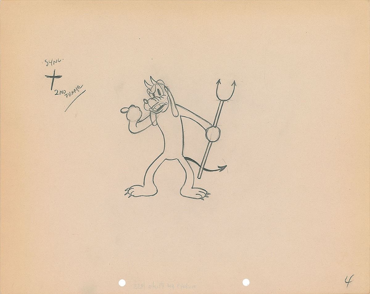 (Walt Disney Studios, 1933) Original production drawing featuring Pluto from Mickey’s Pal Pluto, portraying the normally benevolent pooch as a horned and pitchfork-bearing devil. Accomplished in graphite on untrimmed 12 x 9.5 animation paper. Image measures 3.5 x 4. In fine condition.