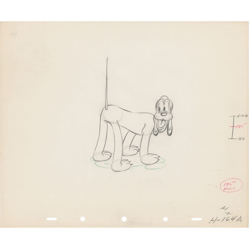(Walt Disney Studios, 1939) Original production drawing featuring Pluto from Society Dog Show, showing him in a desirable full-bodied pose. Accomplished in graphite and colored pencil on untrimmed 12 x 10 animation paper, marked "H-164A" in the lower corner. Image measures 4 x 5.5. In fine condition.