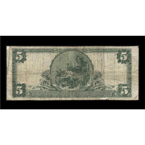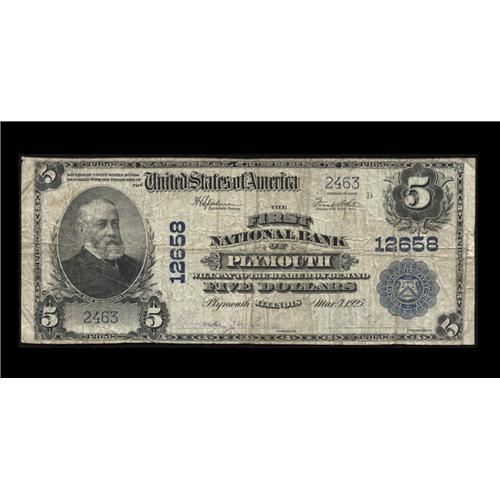 <B>Plymouth, IL</B></I> - $5 1902 Plain Back Fr. 609 <B>The First NB</B></I> Ch. # 12658<BR>The only denomination issued by this scarce Hancock County bank, from which the Kelly census shows only seven large notes extant. <B>Fine.</B></I>