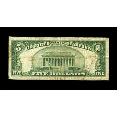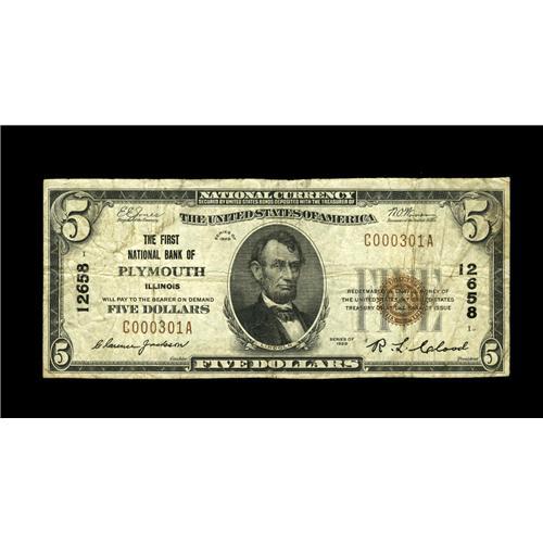 <B>Plymouth, IL</B></I> - $5 1929 Ty. 1 <B>The First NB</B></I> Ch. # 12658<BR>This is a very scarce one bank community, particularly in small size, where the census stands at just three pieces. Pleasing <B>Fine.</B></I>