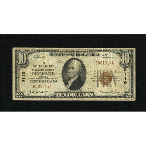 <B>Plymouth, IN</B></I> - $10 1929 Ty. 1 <B>The First NB of Marshall County</B></I> Ch. # 2119<BR>This piece is from a one bank town. Interestingly, nearly twice as many large size survivors are known from this bank, than small size. <B>Very Good.</B></I><BR><BR><b>Shipping:</b> Coins & Currency (<a target="_blank" href="http://www.heritageauctions.com/common/shipping.php">view shipping information</a>)