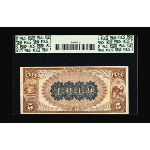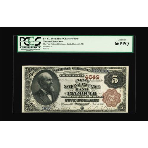<B>Plymouth, MI</B></I> - $5 1882 Brown Back Fr. 472 <B>The First National Exchange Bank</B></I> Ch. # 4649<BR>A gorgeous $5 Brown Back which resides in a PCGS <B>Gem New 66PPQ</B></I> holder. This piece is a well margined pen signed beauty which appears to have well deserved this exalted grade.
