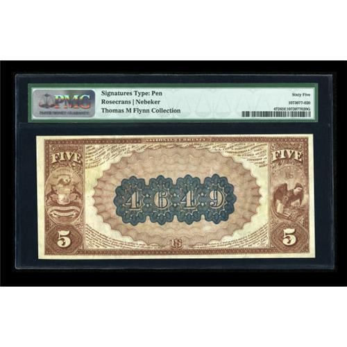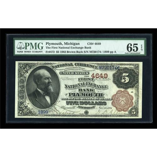 <B>Plymouth, MI</B></I> - $5 1882 Brown Back Fr. 472 <B>The First National Exchange Bank</B></I> Ch. # 4649<BR> A lovely $5 Brown Back which has everything a collector could desire. It's a well margined piece with great color, full originality, and nice pen signatures, making it a great representative of its type. PMG has certainly concurred, assigning this note a grade of <B>Gem Uncirculated 65 EPQ. </B></I>If quality is your goal, this note is certain to satisfy. <BR><I>From The Thomas M. Flynn Collection</B></I><BR><BR><b>Shipping:</b> Coins & Currency (<a target="_blank" href="http://www.heritageauctions.com/common/shipping.php">view shipping information</a>)