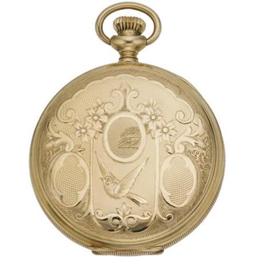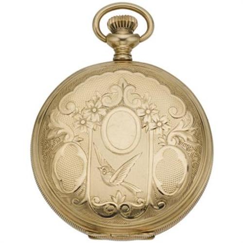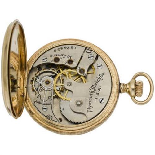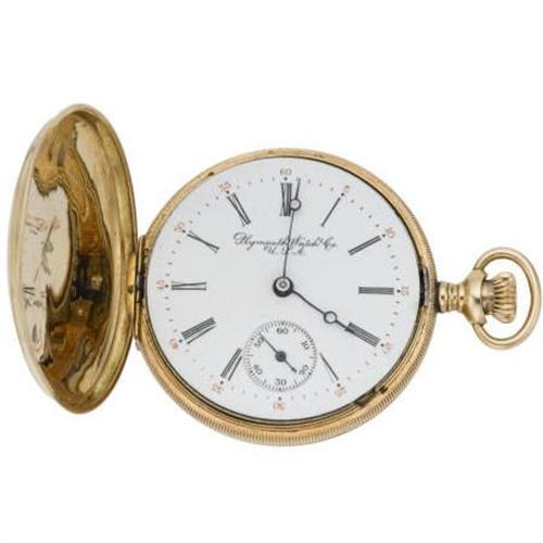 <B>Plymouth Watch Co., Gold Hunting Case Pocket Watch</B></I><BR><BR>Case: 37 mm, hinged 14k yellow gold, ornately decorated with a bird motif, marked 539584<BR>Dial: matte white with black Roman numerals, black hour and minute hands, together with a sunken auxiliary dial with sweep seconds, signed Plymouth Watch Co. USA <I>(missing crystal)</B></I><BR>Movement: 31 mm, 15 jewels, #1874429<BR>Signed: double signed Plymouth Watch Co. on movement and dial <B>Condition Report:</B> Fair condition.<BR>The pocket watch winds, but does not seem to work.<BR>Hour hand is bent.<BR><BR><b>Shipping:</b> Miscellaneous Collectibles, Smal (<a target="_blank" href="http://www.heritageauctions.com/common/shipping.php">view shipping information</a>)