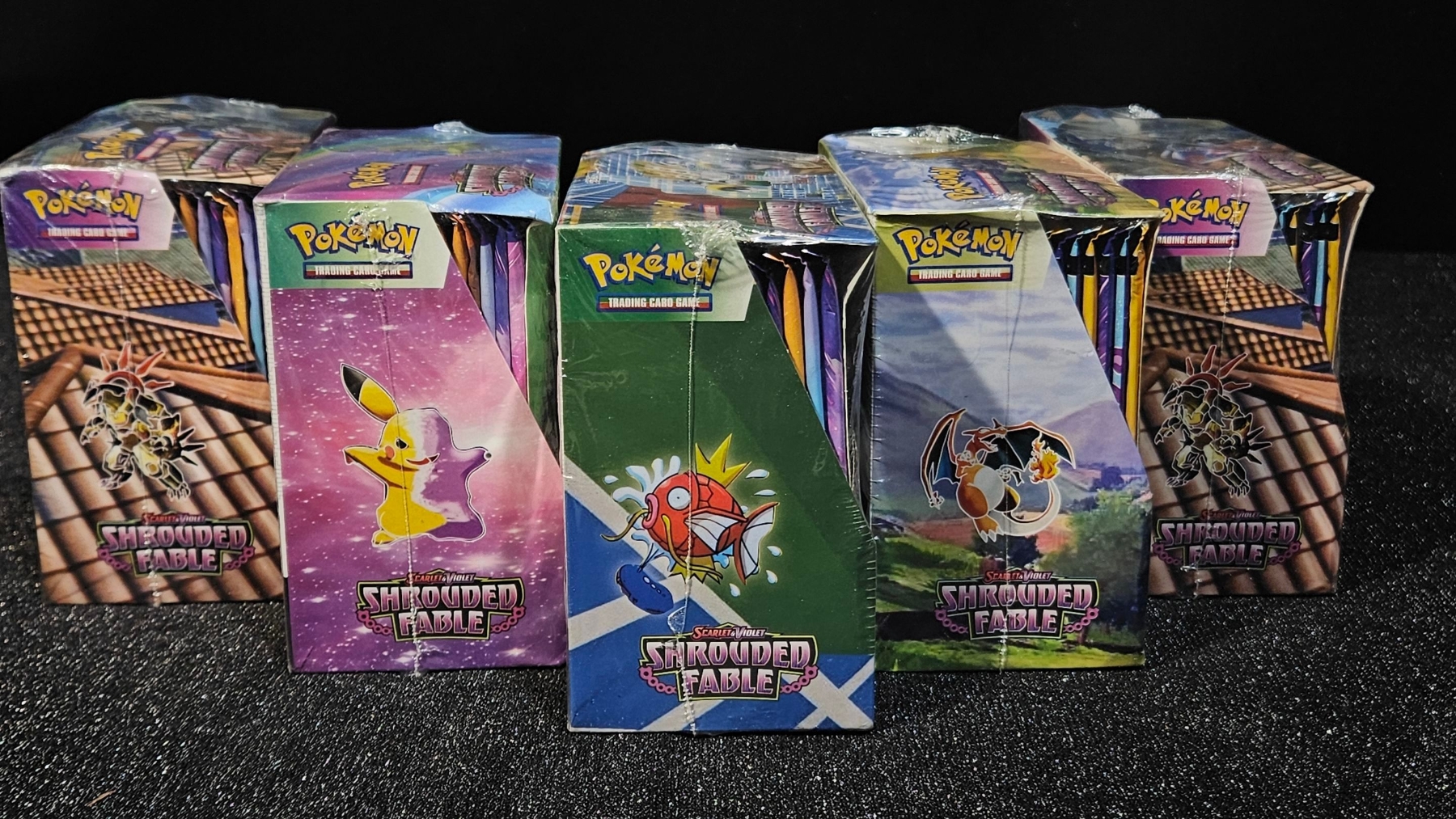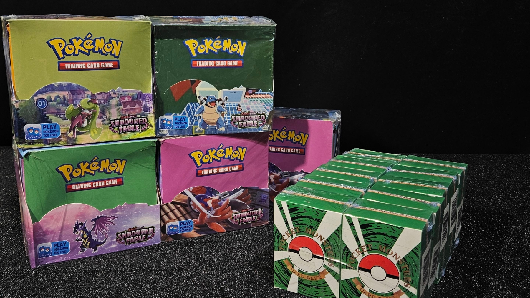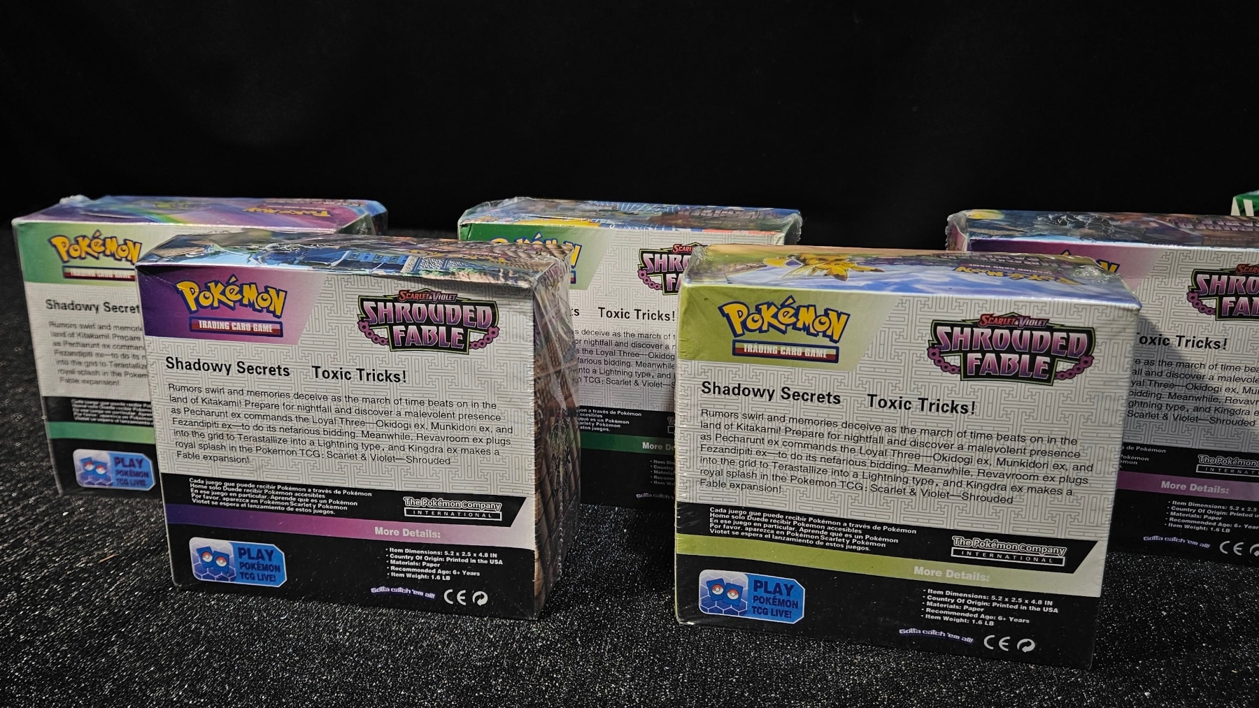 Upgrade your decks with a Po-kee-mon Shrouded Fable booster bundle! This lot includes five sealed booster boxes, plus an additional ten pocket monsters packs, giving you dozens of chances to pull your chase cards! The Po-kee-mon Shrouded Fable booster bundle is perfect for avid collectors and for those who love the thrill of opening packs.