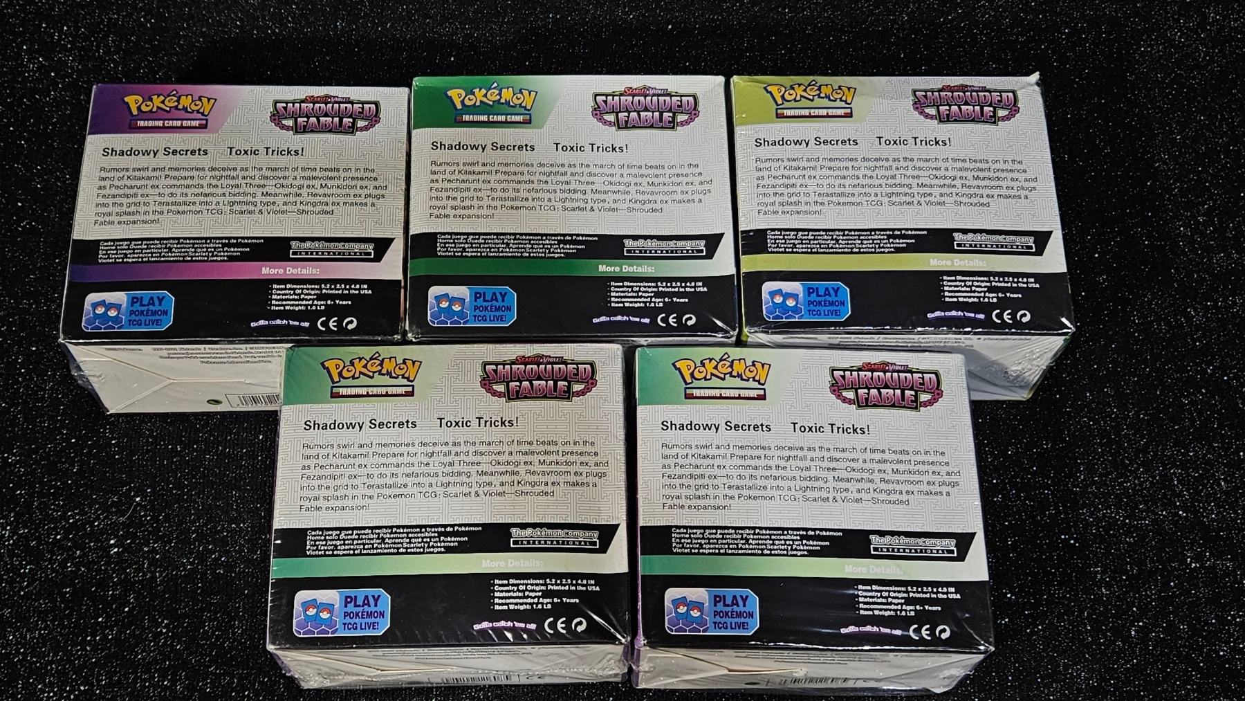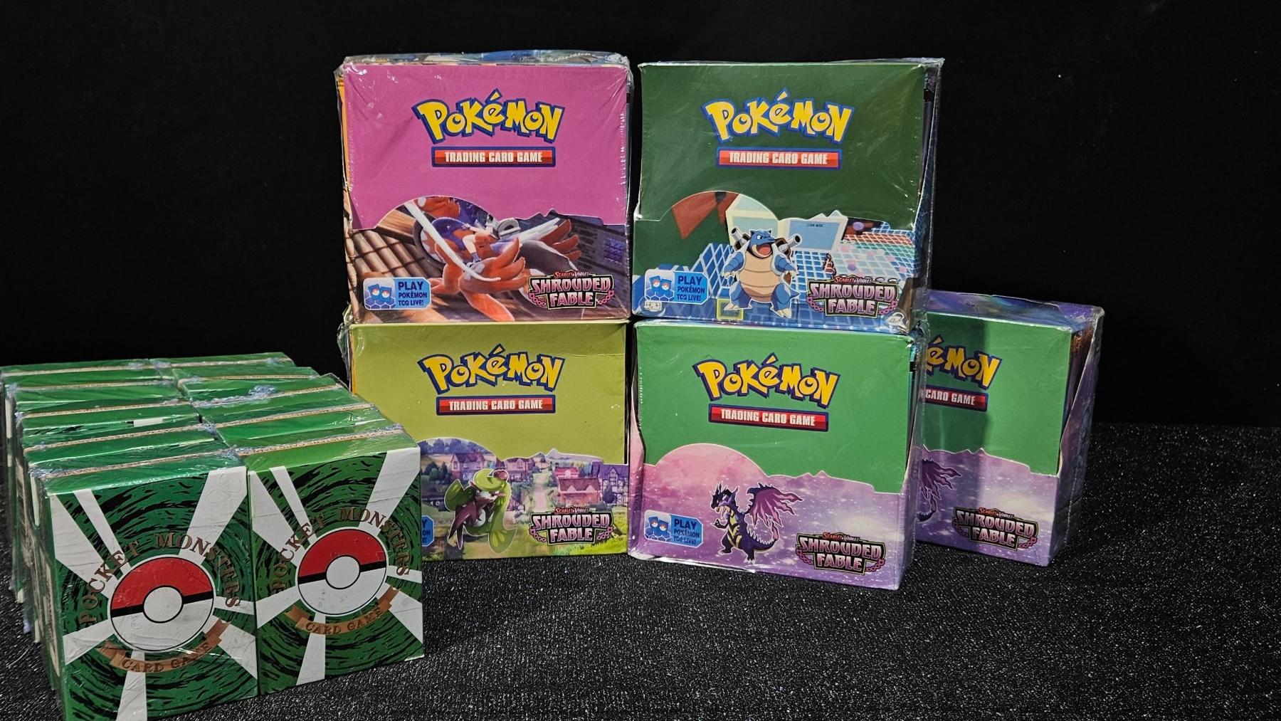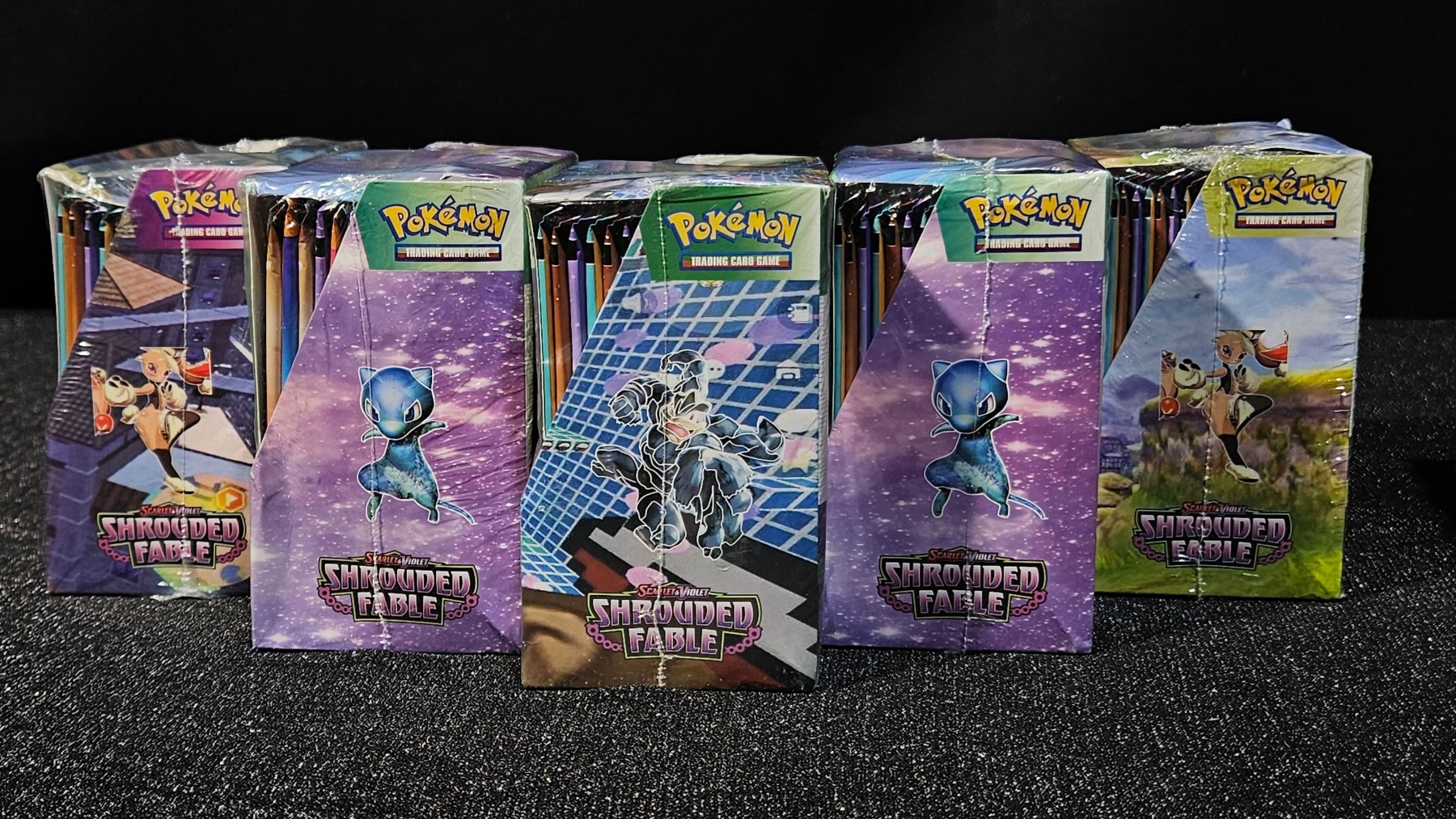 Upgrade your decks with a Po-kee-mon Shrouded Fable booster bundle! This lot includes five sealed booster boxes, plus an additional ten pocket monsters packs, giving you dozens of chances to pull your chase cards! The Po-kee-mon Shrouded Fable booster bundle is perfect for avid collectors and for those who love the thrill of opening packs.