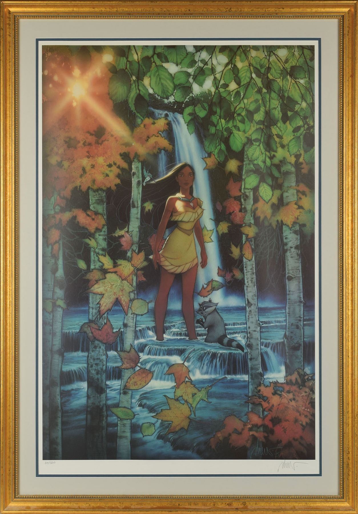 Two Pocahontas items: a huge limited edition color 23 x 36 lithograph of Pocahontas by Drew Struzan, numbered 34/500, signed in the lower border in pencil by the artist, double-matted and framed to an overall size of 30 x 42; and a limited edition 13 x 10 sericel entitled 'Woodland Friends,' showing Pocahontas surrounded by critters, released in an edition of 5000, double-matted and framed to an overall size of 21.5 x 18.5. In overall fine condition. Both are accompanied by Walt Disney Company certificates of authenticity.