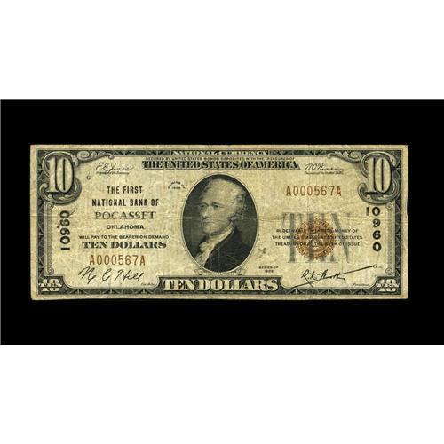 <B>Pocasset, OK</B></I> - $10 1929 Ty. 1 <B>The First NB</B></I> Ch. # 10960<BR>An extremely scarce note from the only bank to issue in this tiny Grady County location. Just four large and three small notes comprise the entire census from here, with no offerings of any kind reported since 1998. <B>About Fine.</B></I><BR><BR><b>Shipping:</b> Coin/Currency (<a target="_blank" href="http://www.heritageauctions.com/common/shipping.php">view shipping information</a>)